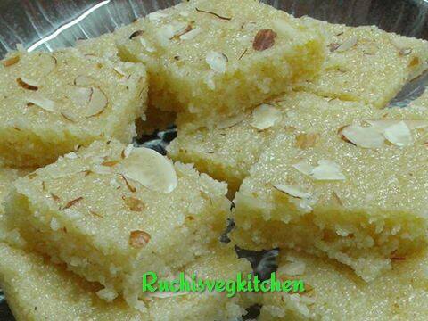 Add hot milk and sugar to the rava, mix well and cook. Add roasted crushed almonds and mix and continue to cook till the mixture begins to leave the sides of the pan. Add Cardamom Powder.