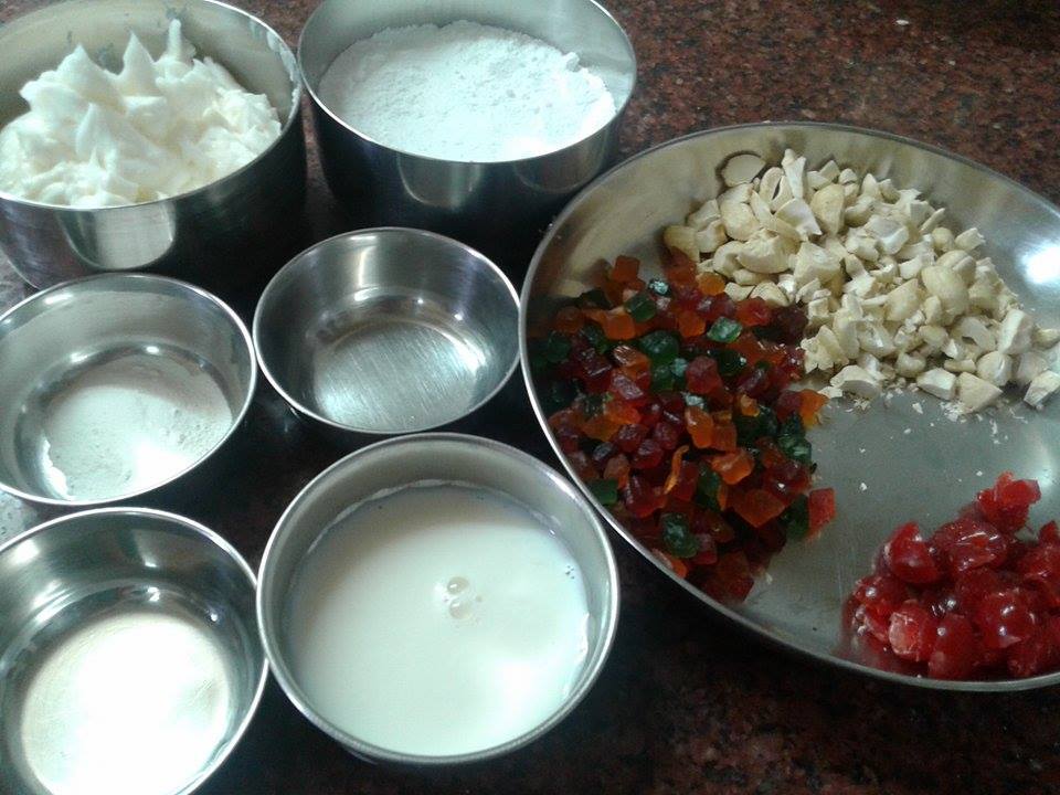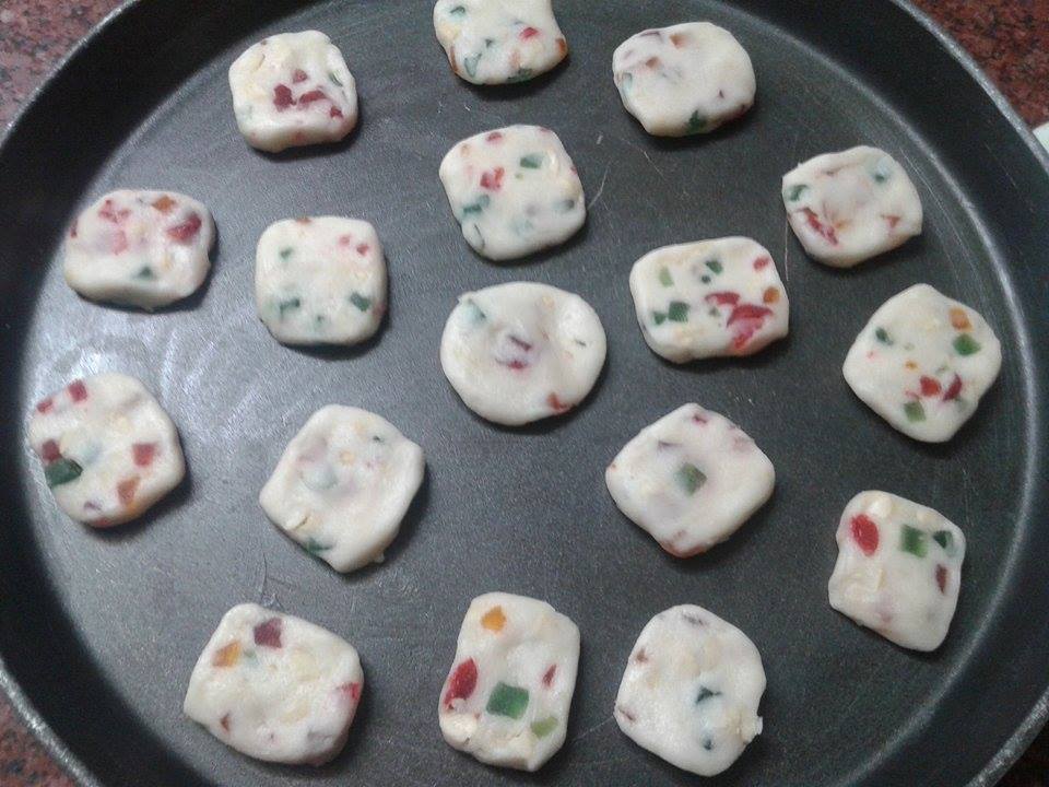• Now add the tutti futti, cherri, cashew and combine well. Sprinkle milk to form a soft and sticky dough.