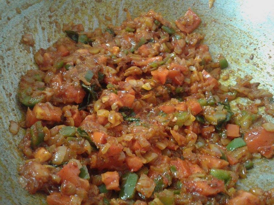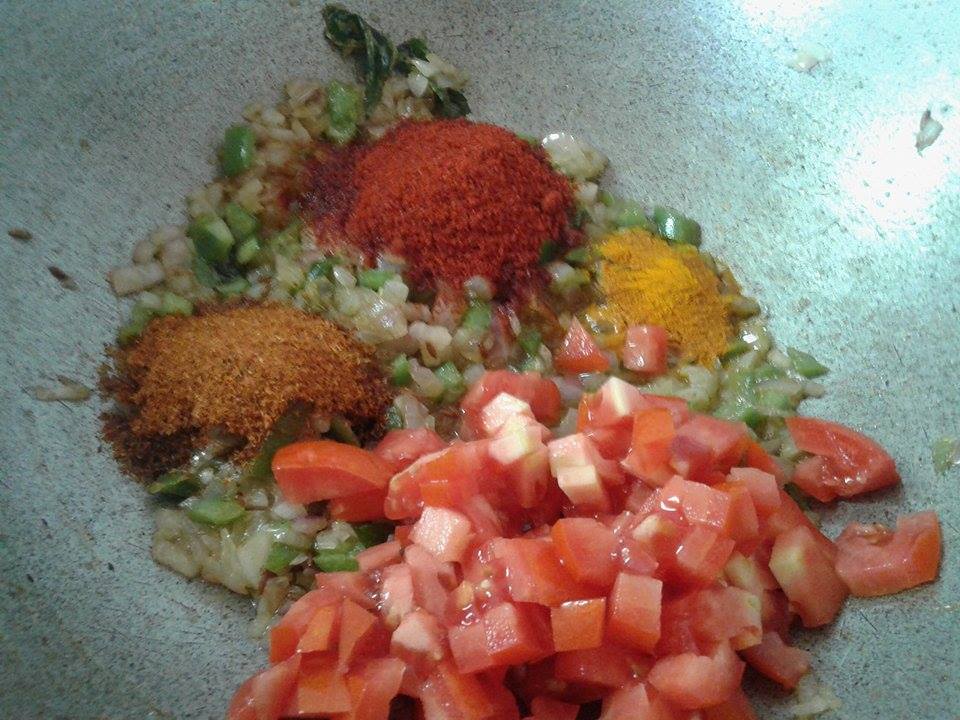 then add the finely chopped tomatoes and capsicum.stir and add all the spice powders – turmeric, red chili powder and pav bhaji masala.