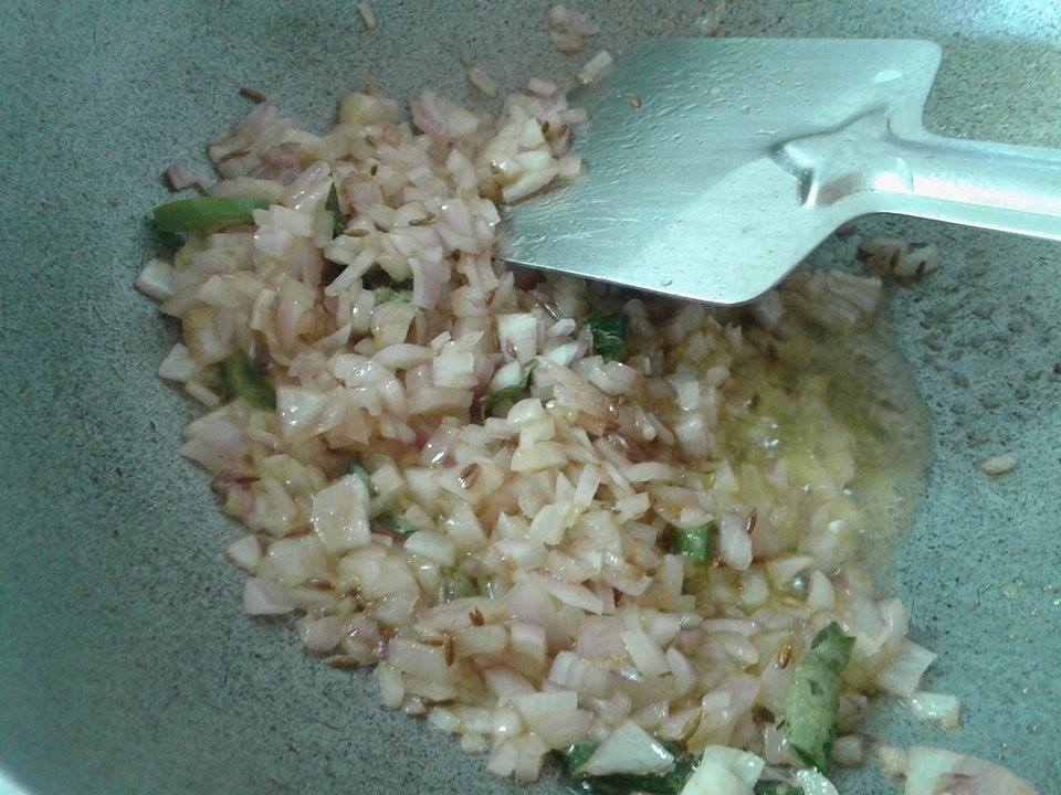 In a pan or kadai melt the butter. add the cumin and fry them till they get browned.add the finely chopped onions and saute till translucent. Add the ginger garlic paste and saute till the raw aroma goes away.
