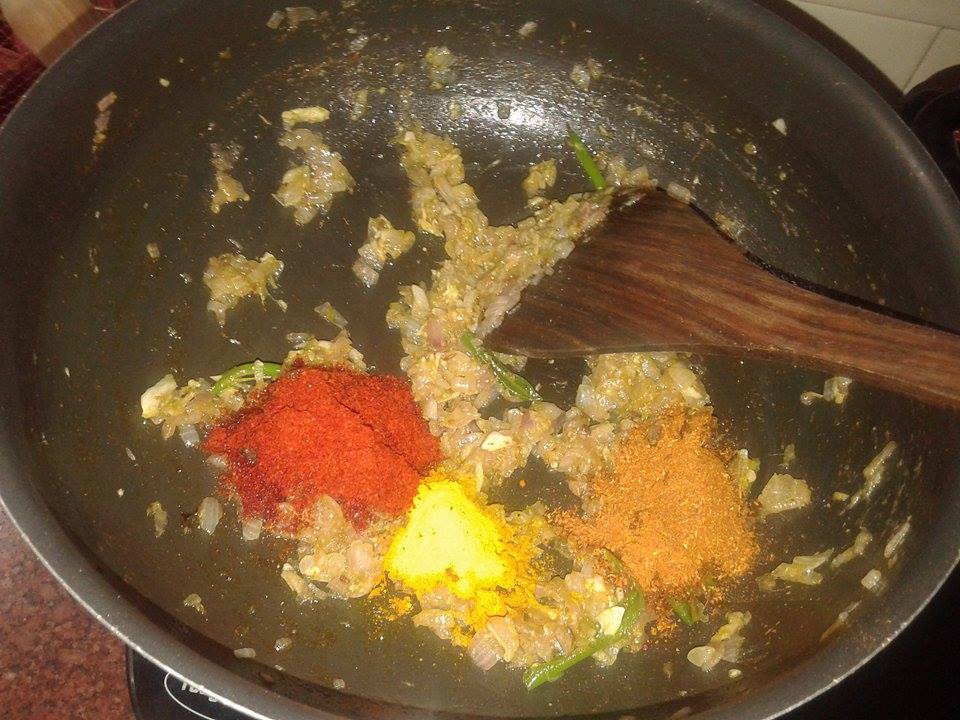 Then add Hind then onions, green chillies and saute them till they golden browned.take care not to burn them as this will impart bitter tones in the curry.keep on stirring the onions while sauting them, for uniform cooking and also so that they don’t get burnt.