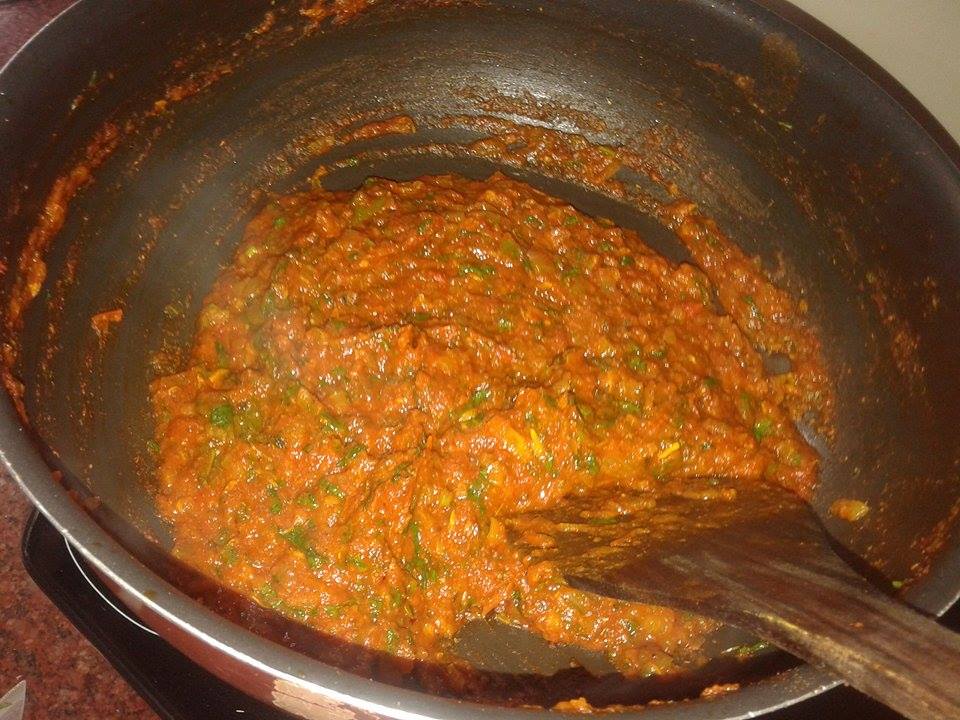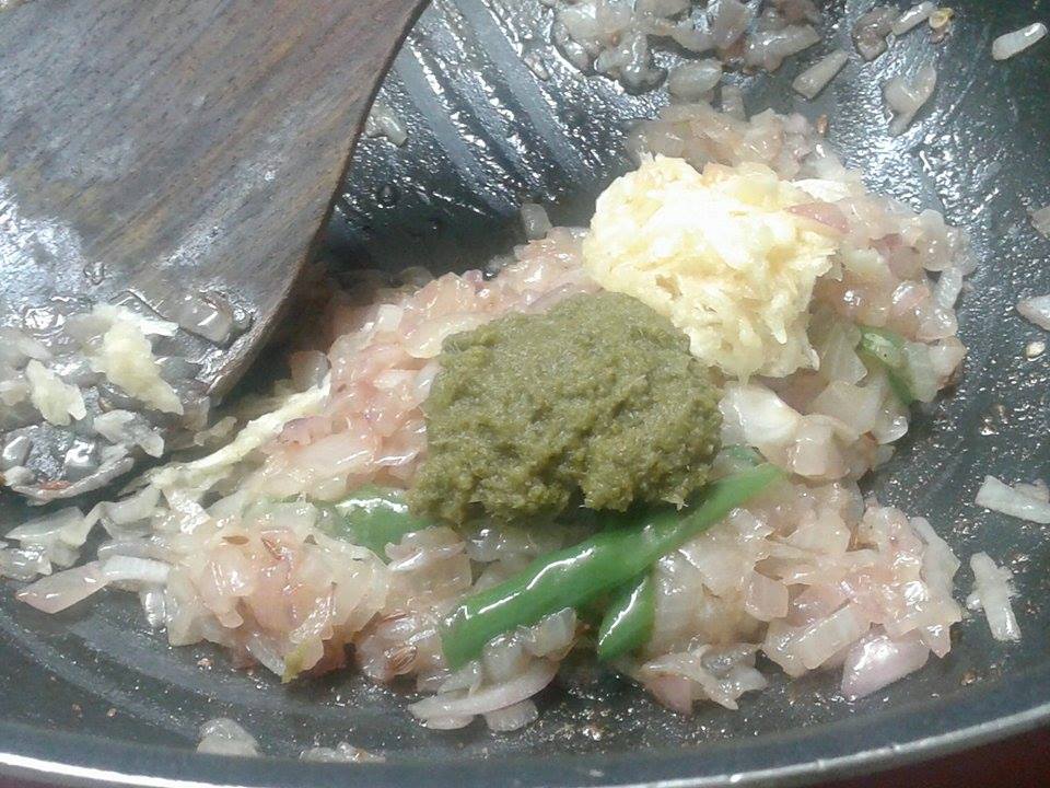 add the garlic paste, ginger-chili paste. stir and saute for 5-10 seconds on a low flame.