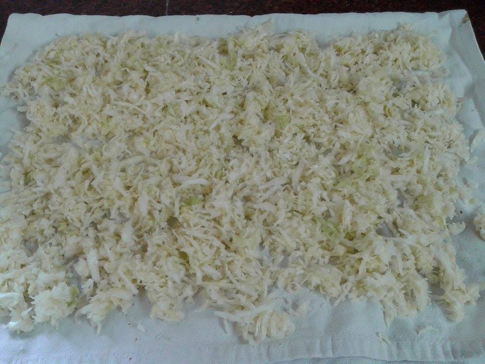 Take grated Cabbage in a plate. Sprinkle 1/2 tsp salt and mix properly with ur hands. Leave for 2 to 3 mins. Again mix properly and with tight hands sqeeze all water ftom cabbage. On a thick cotton cloth let it dry for 1 hr.