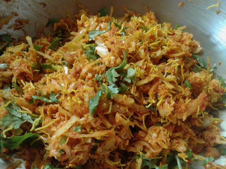 Now take it out add salt, sev and chopped corriander. Mix well.