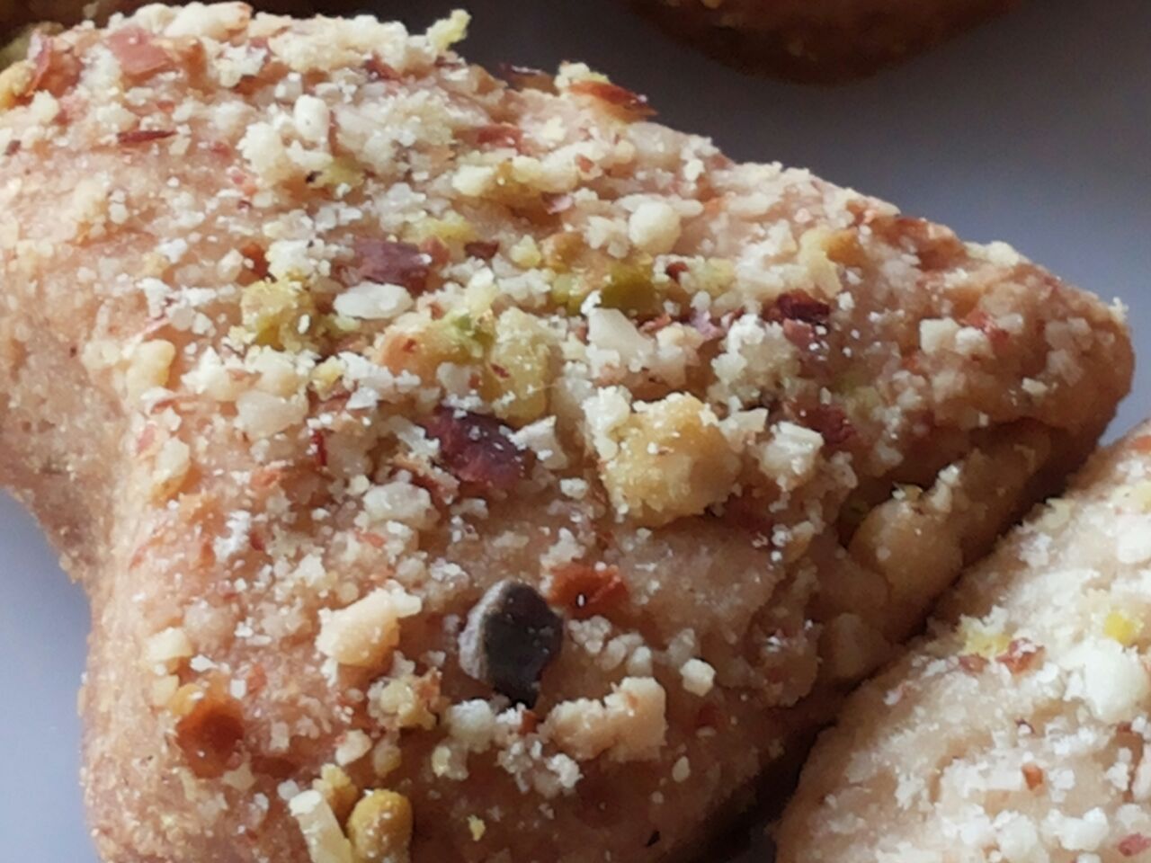 On dusted surface, Using Roll pin, roll the dough into thick roti. Spread Almond Pistachio on roti and again roll once . So nuts will be stick nicely .
