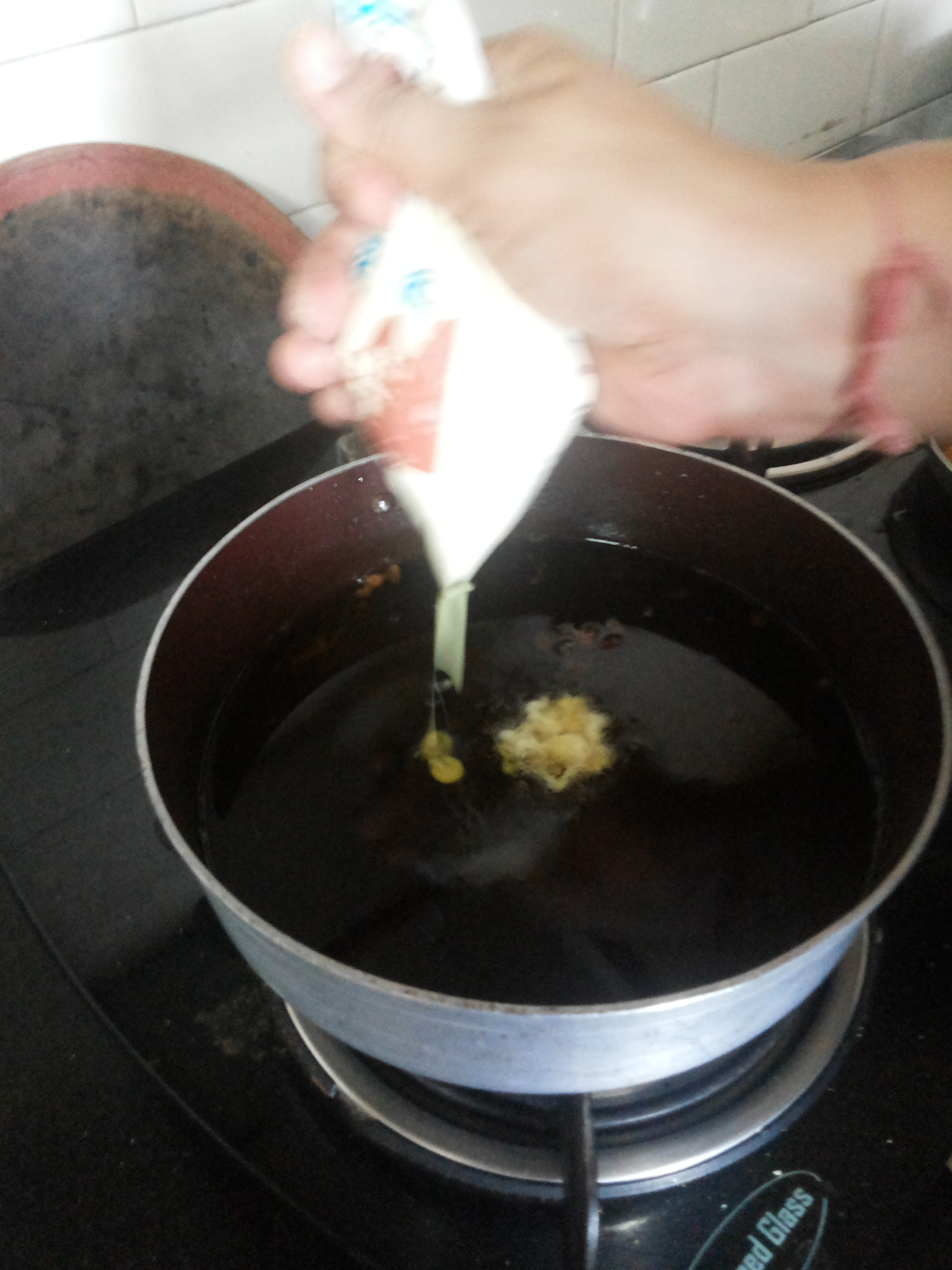 When i took this pic, it was my first attempt in giving shape, so bare with me but hope you get perfect idea how to use milk bag. Many uses Empty Ketchup bottle. At time of giving shape , always turn ur hand from outer round to inner one.