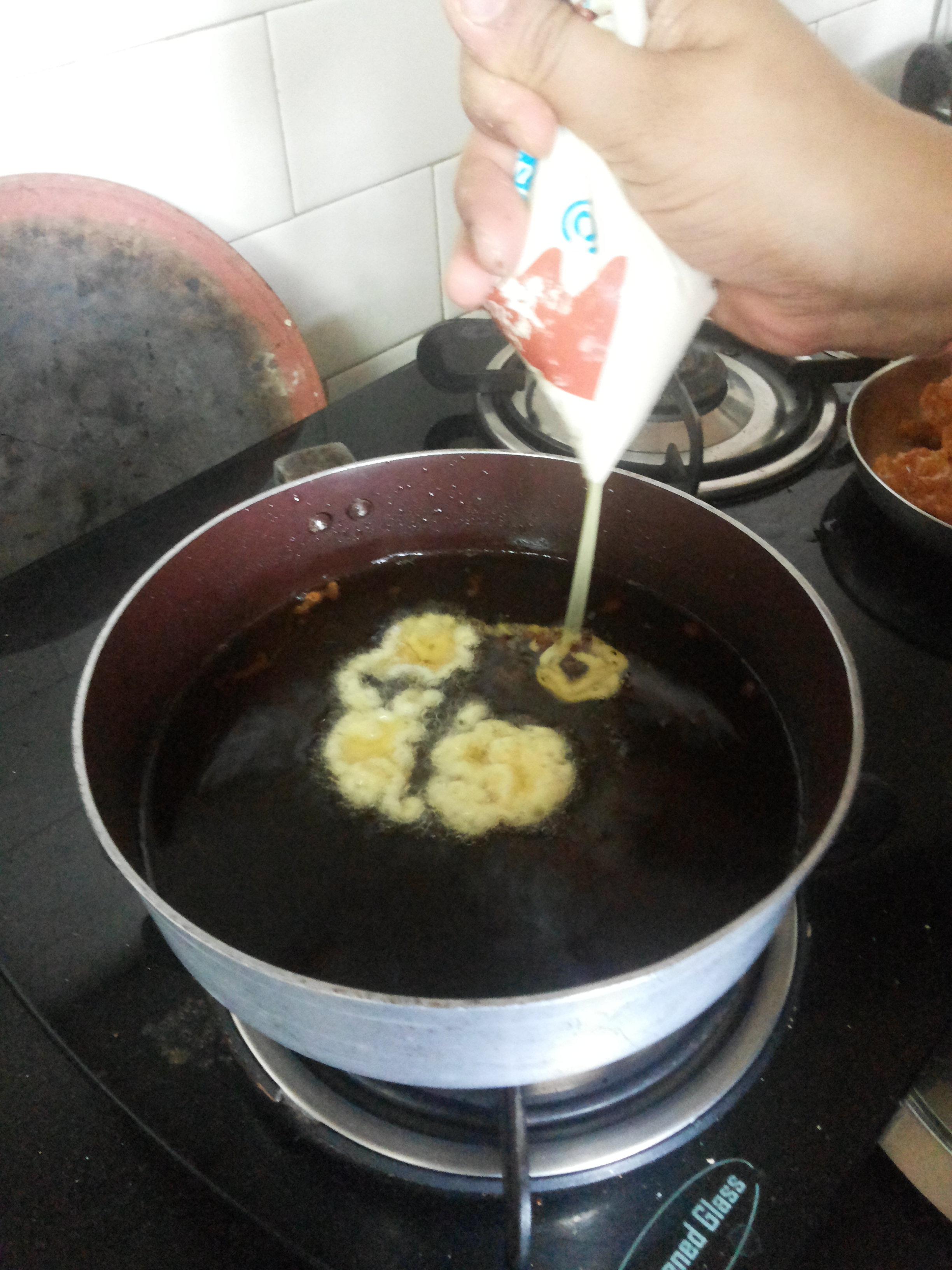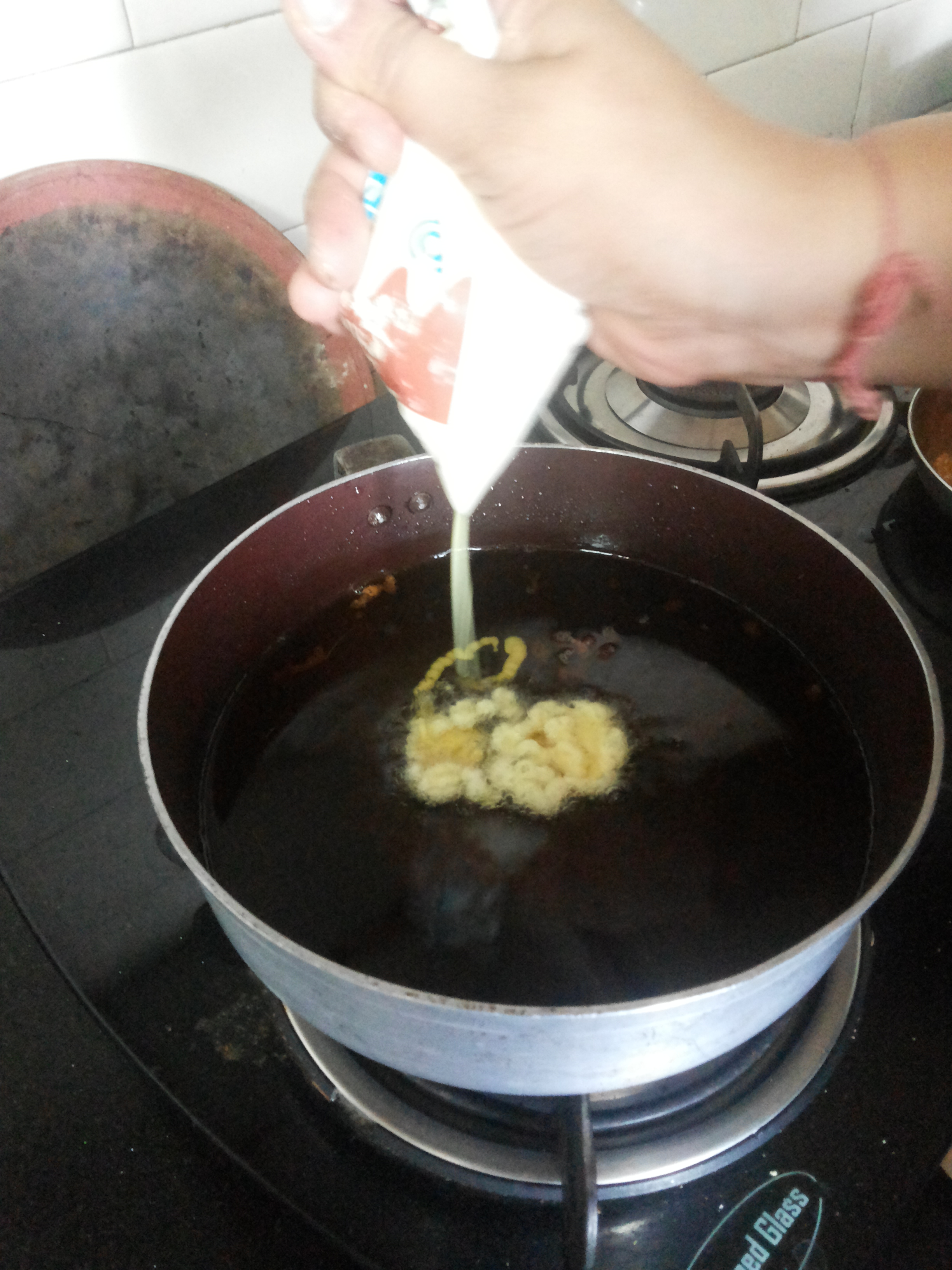 Pour batter in Milk bag. Gather all Sides together and hold firmly. Try to give the best shape , and deep fry in hot Ghee.