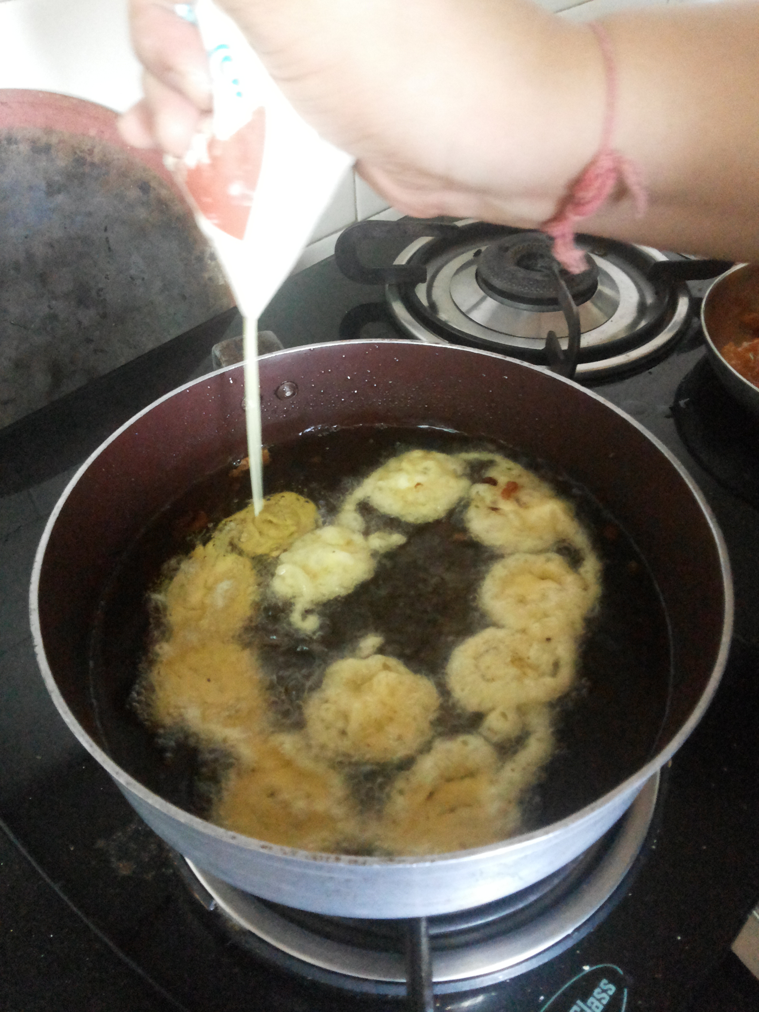 I recommend a flat bottomed non stick pan to fry jalebis. as its very easy to see what shape we are giving .