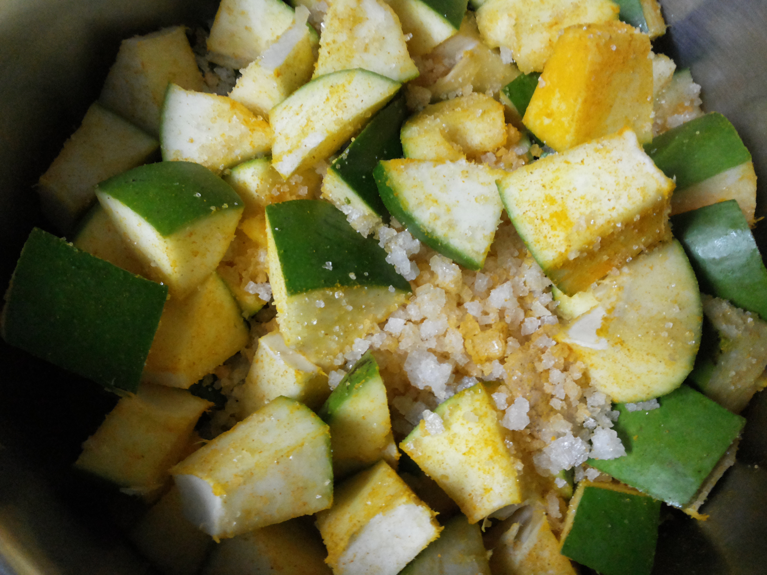After 1 or 1.5 hr you can see some water is released from mango. But salt wont be dissolve fully. So slowly take out that water and add with White chick peas and Fenugreek seeds. . Before adding mango water to chana and methi , make sure they are well soaked.