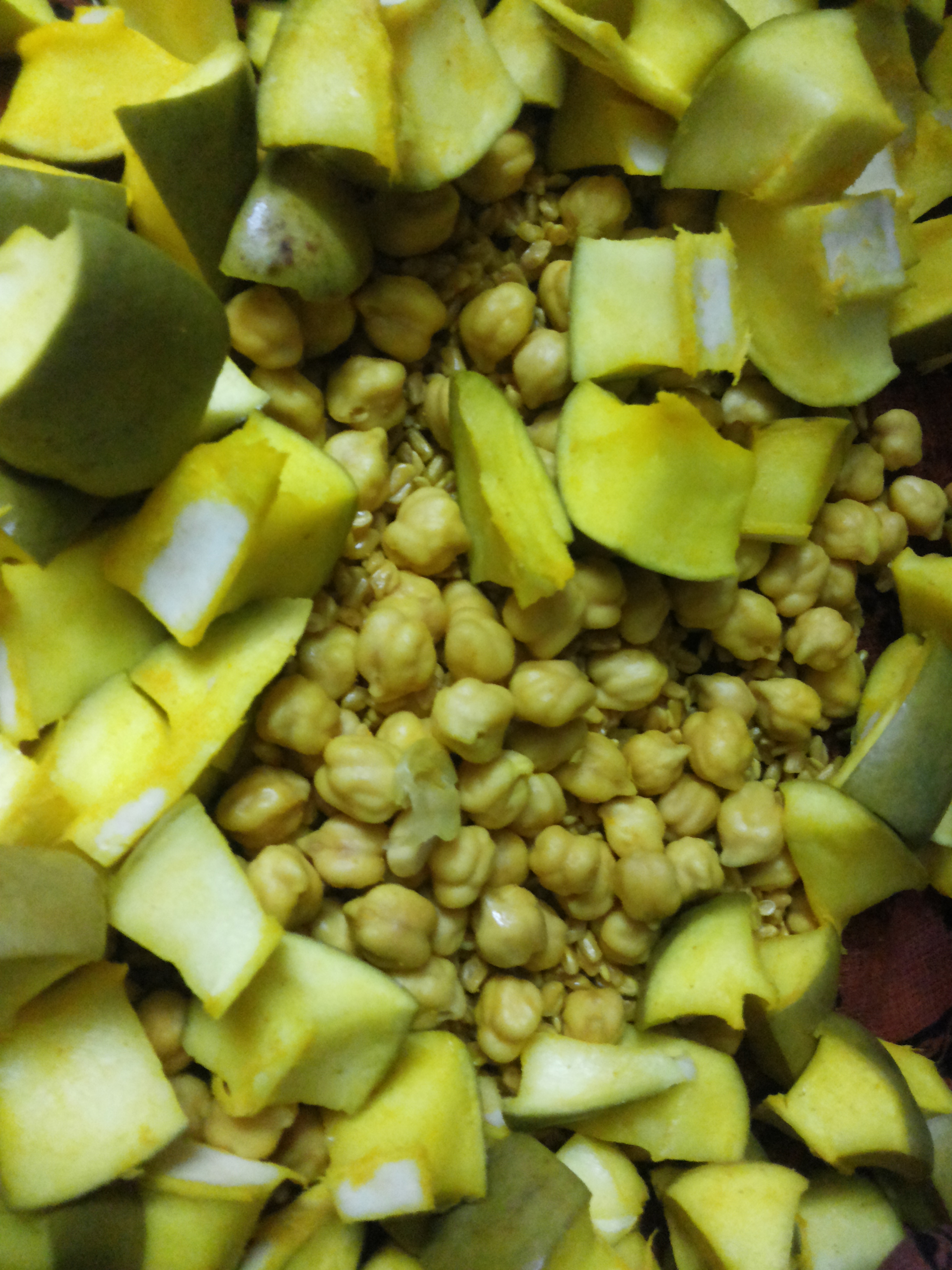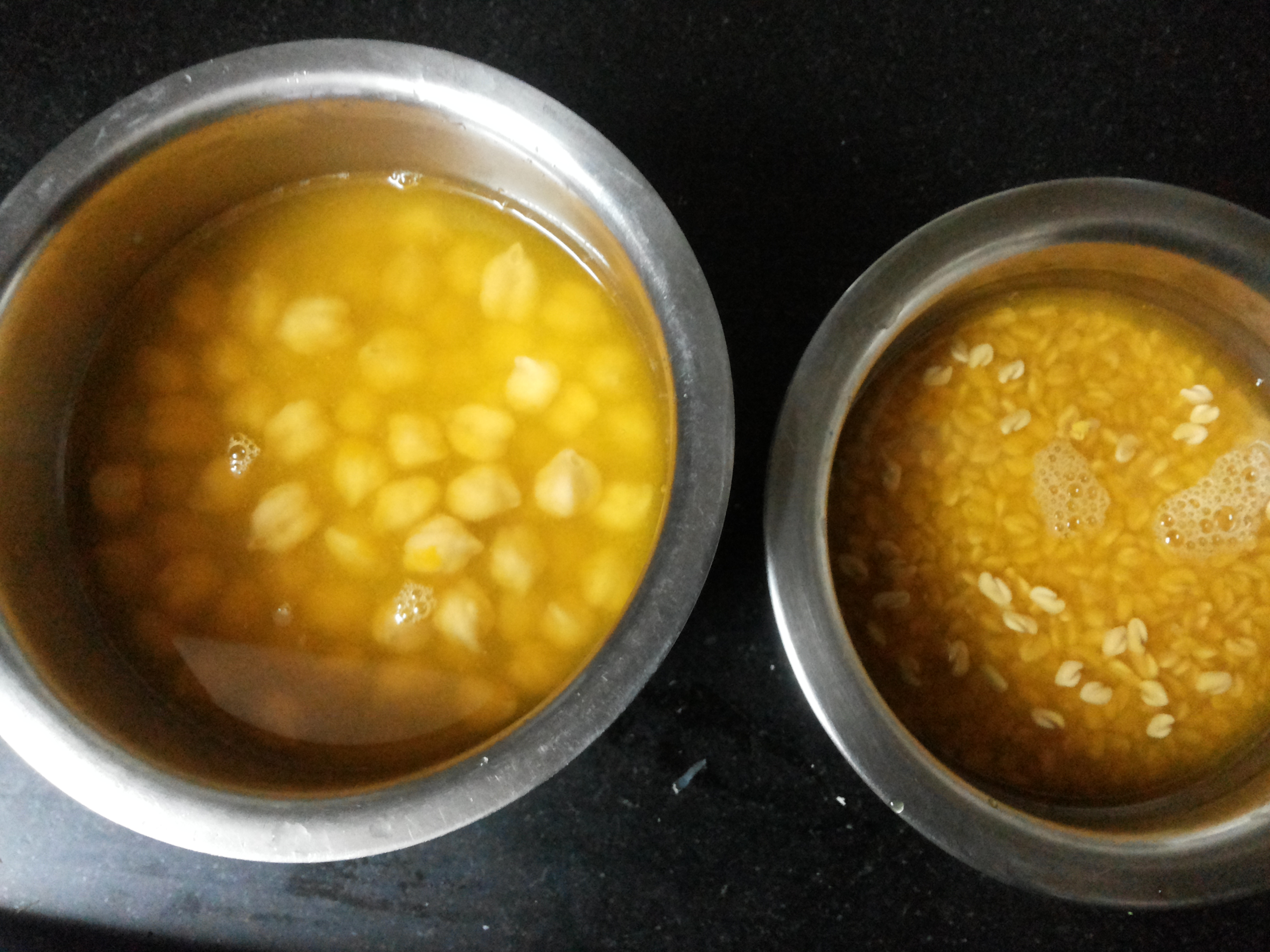 Wash White Chick Peas and Fenugreek Seeds and soak separately in good amount of water for 6 to 8 or overnight. Again wash properly and add a cup of water in each. Again allow it soak till mango water is ready.