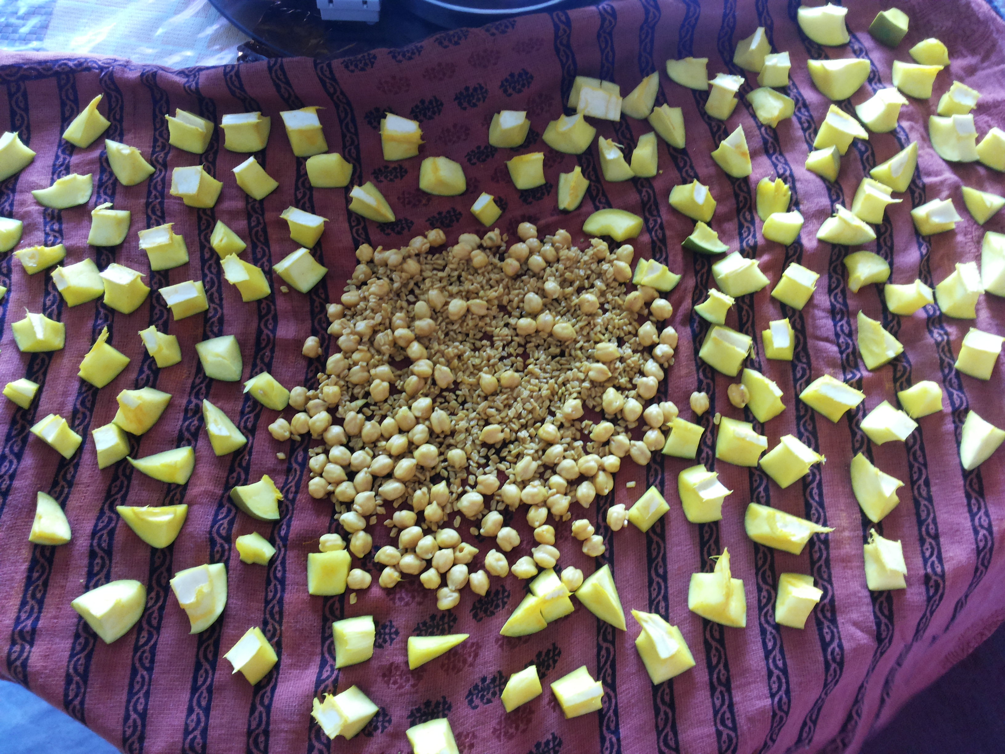 Allow mango to soak for at least 5 to 6 hrs . Now we will first dry mango. White chick peas and fenugreek seeds are still in mango water .
