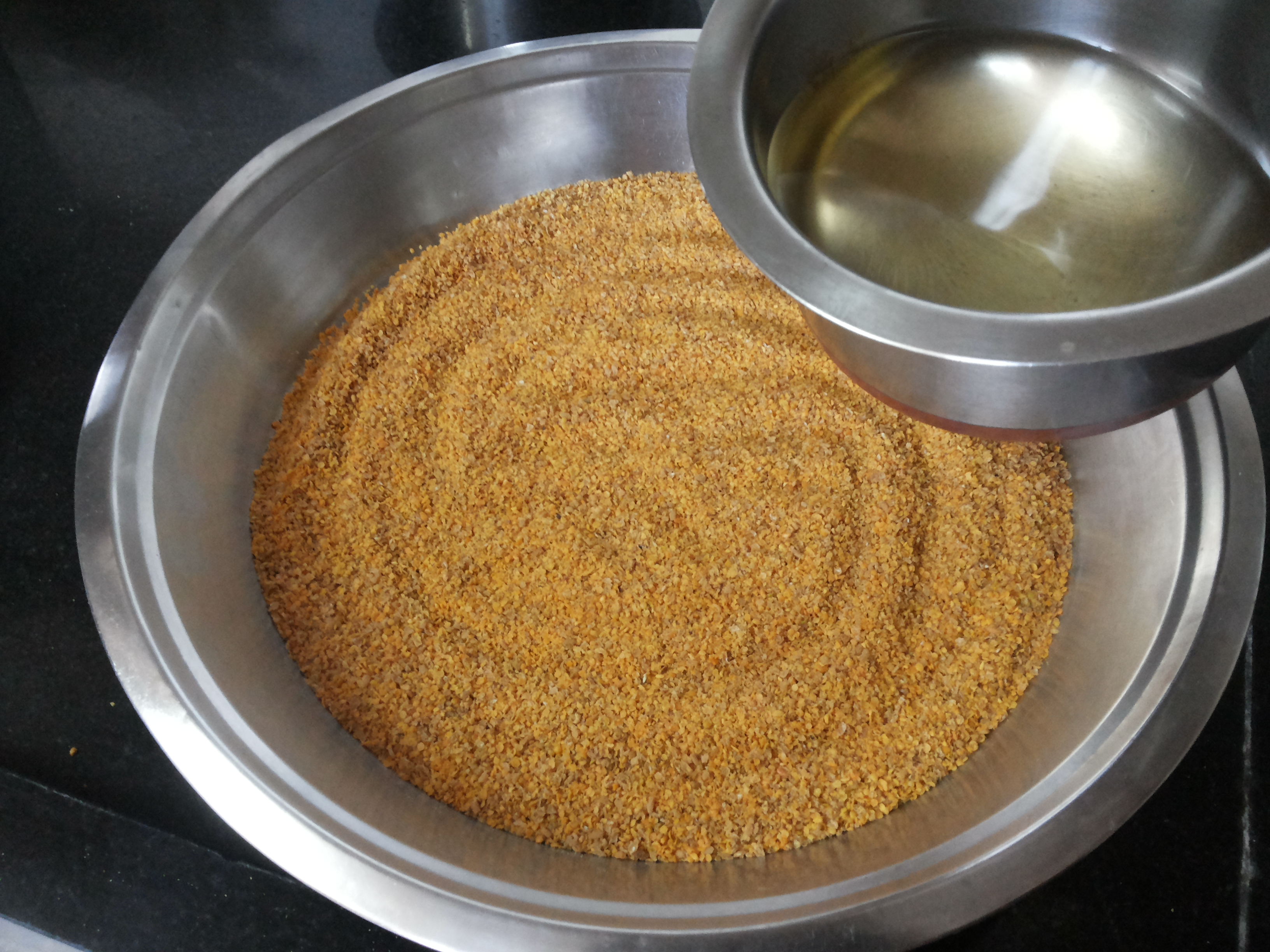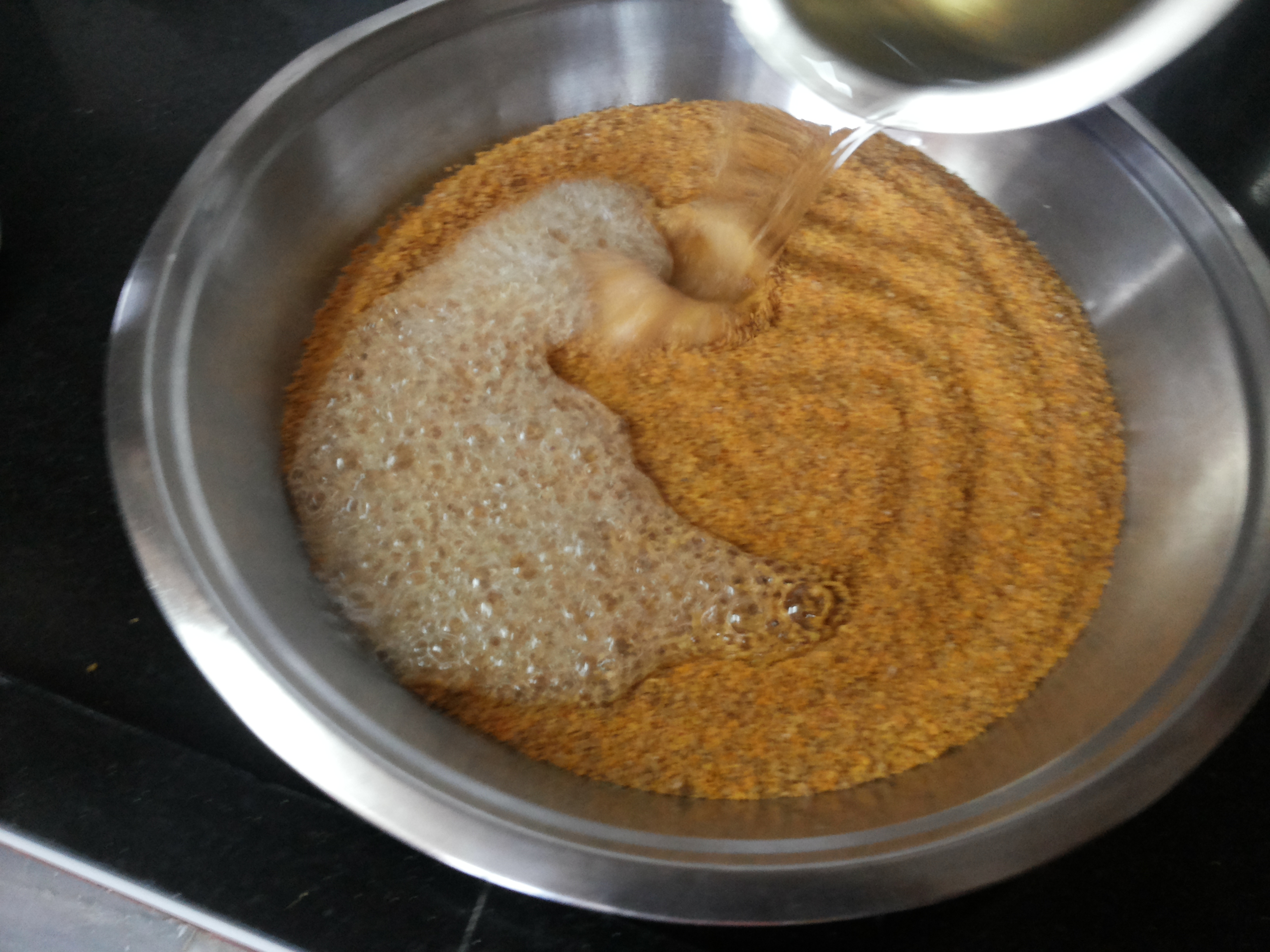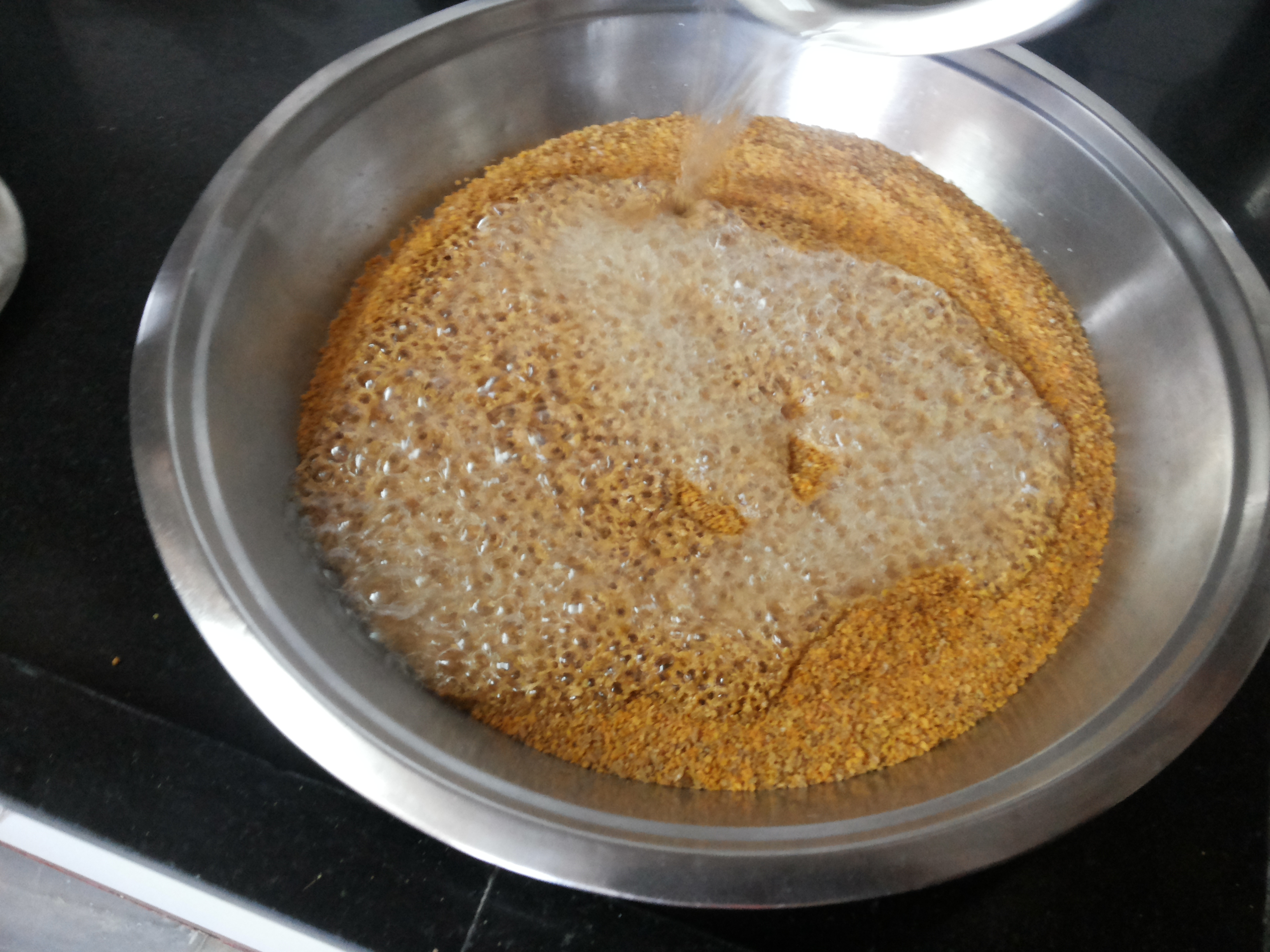 Take Mustard splits and Fenugreek Seeds. sift and clean them. In a mixer jar take them together. We have to grind them slightly. Use pulse method to grind. Dont grind continuously as we are not making powder . Now spread nicely in a big plate.