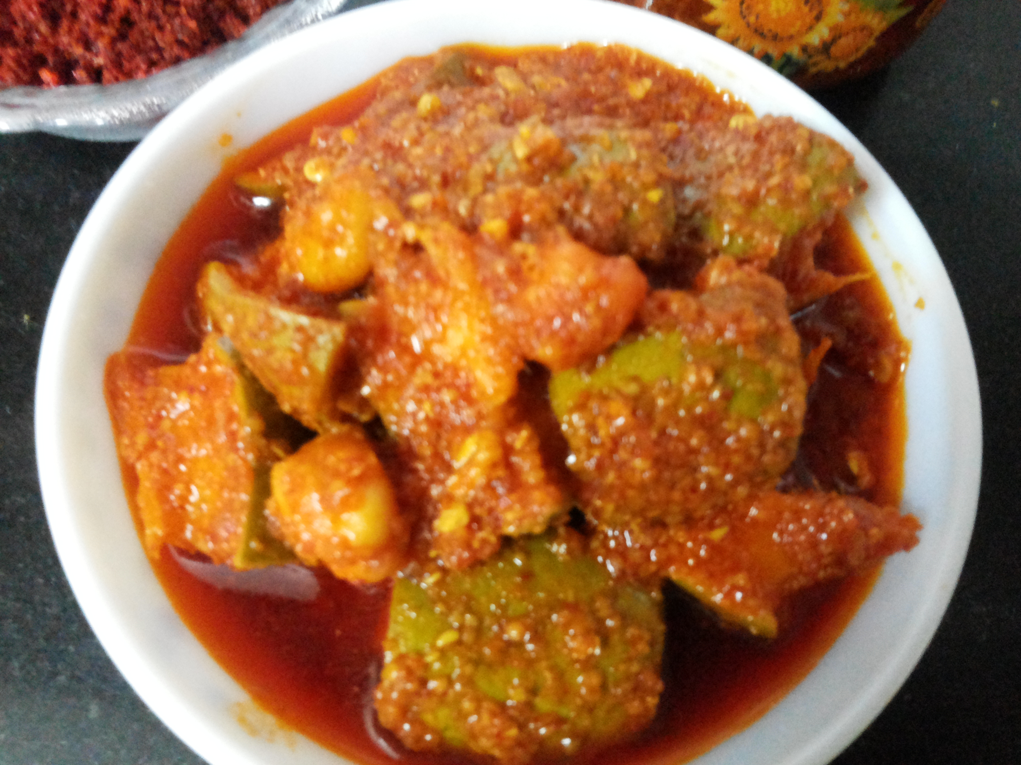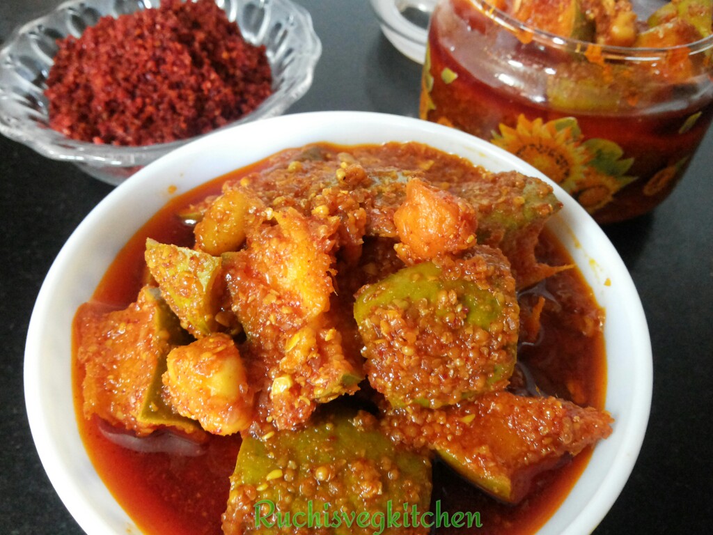 A typical Gujarati pickle of raw mangoes, white chick peas and Dry Fenugreek seeds perked up with a large assortment of spices and preserved with mustard oil, this pickle has a wonderful mix of flavors ranging from sour to spicy.