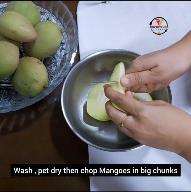 - Wash and clean the Raw Mangoes. Once Dry fully cut into cube size.