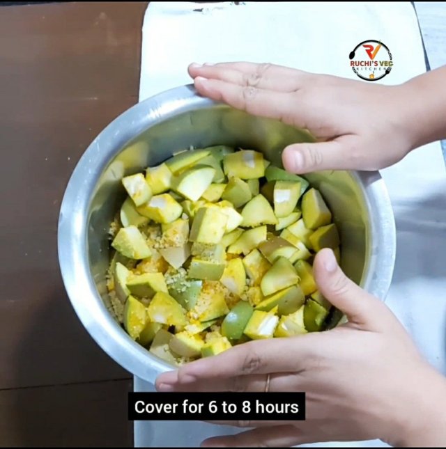 - Now add Rock salt and turmeric powder. Mix very well. Close the lid and keep aside for at least 8 to 10 hours. Keep on mixing after every 2-3 hrs.
