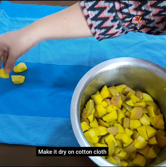 - . Now Squeeze gently and dry this mango pieces on a cotton cloth for 12 to 16 hrs or till Mangoes get fully dry. If possible make it sundry.. make sure , it dont turn over dry and chewy .