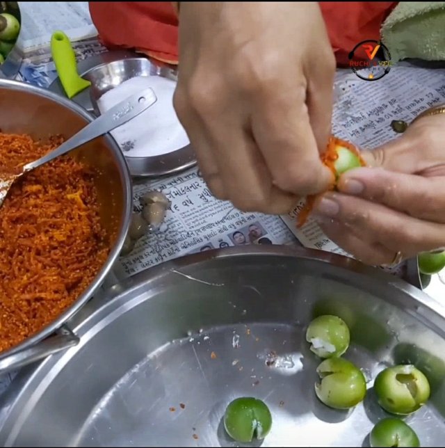 - Clean Gunda and deseed it. Fill grated mixture of raw mangoes to this this gunda. Fill nicely .
