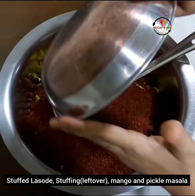 - One has to keep mixing pickle for a week, twice in a day. This way you can increase the shell life and masala will be nicely mixed up with Goonda and Mango.