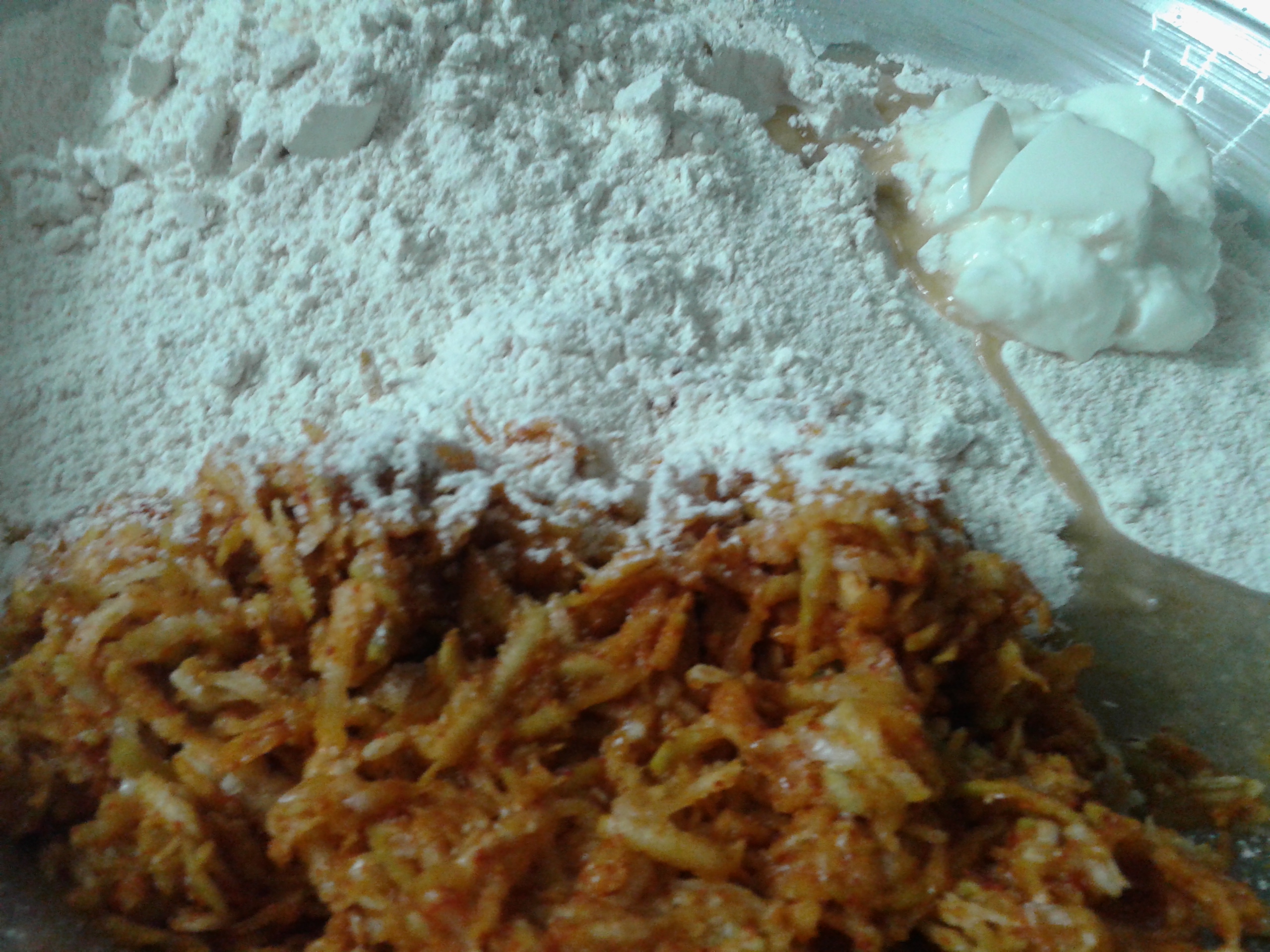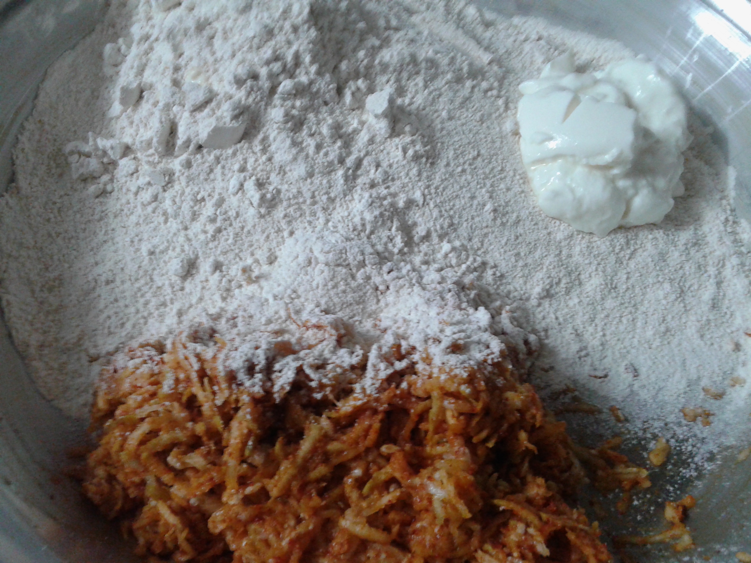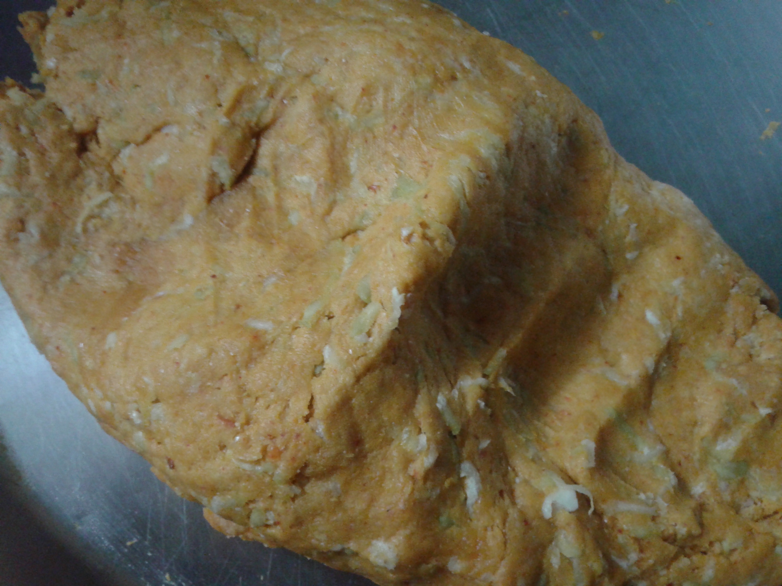 Add all spices to grated bottle guard, mix well. Now add Whole wheat Flour , curd and Oil. Mix very well and knead a dough with some water. As Bottle guard will release some water, we dont need much water to knead the dough. Dough should not be too soft or too stiff,