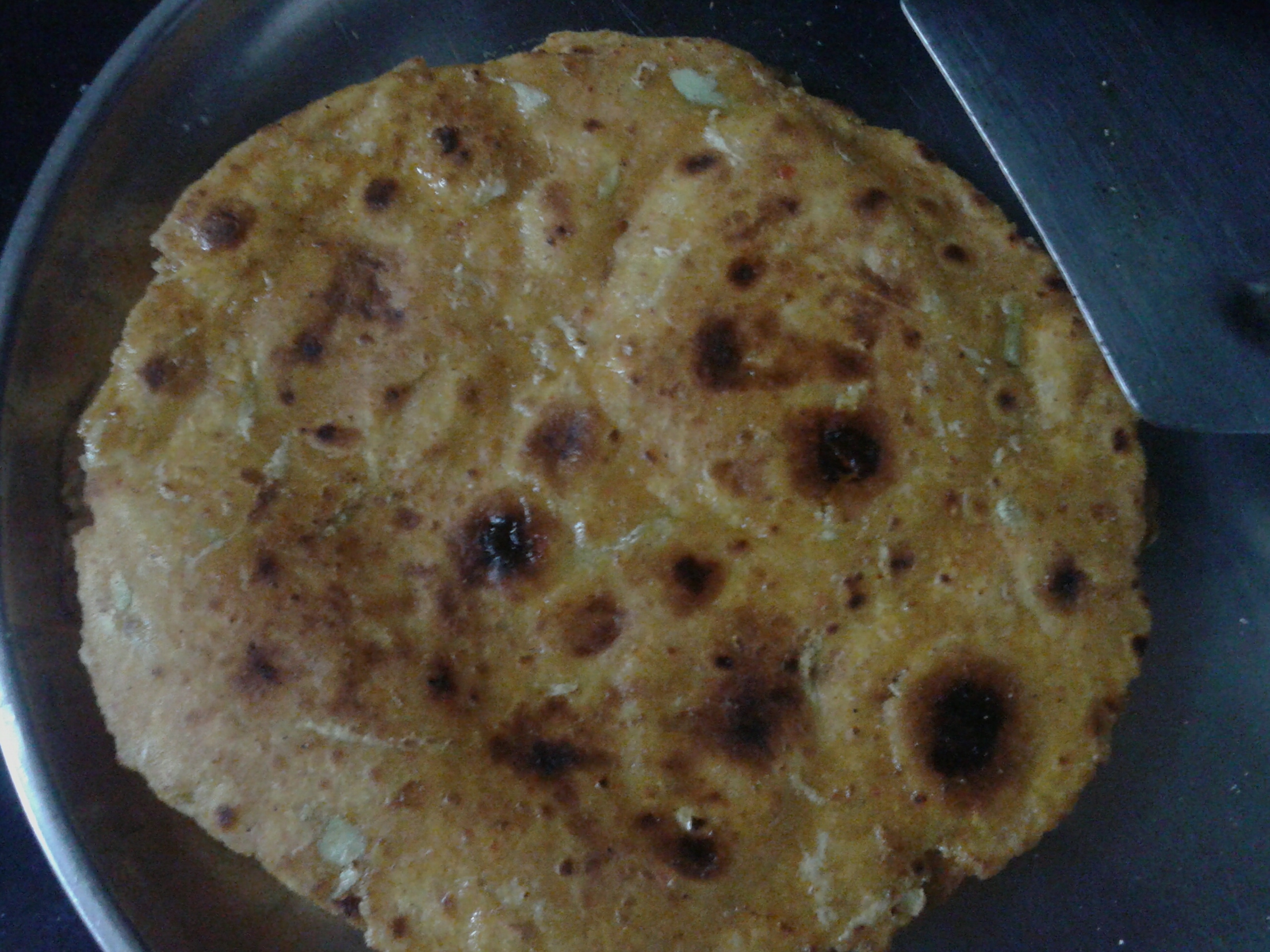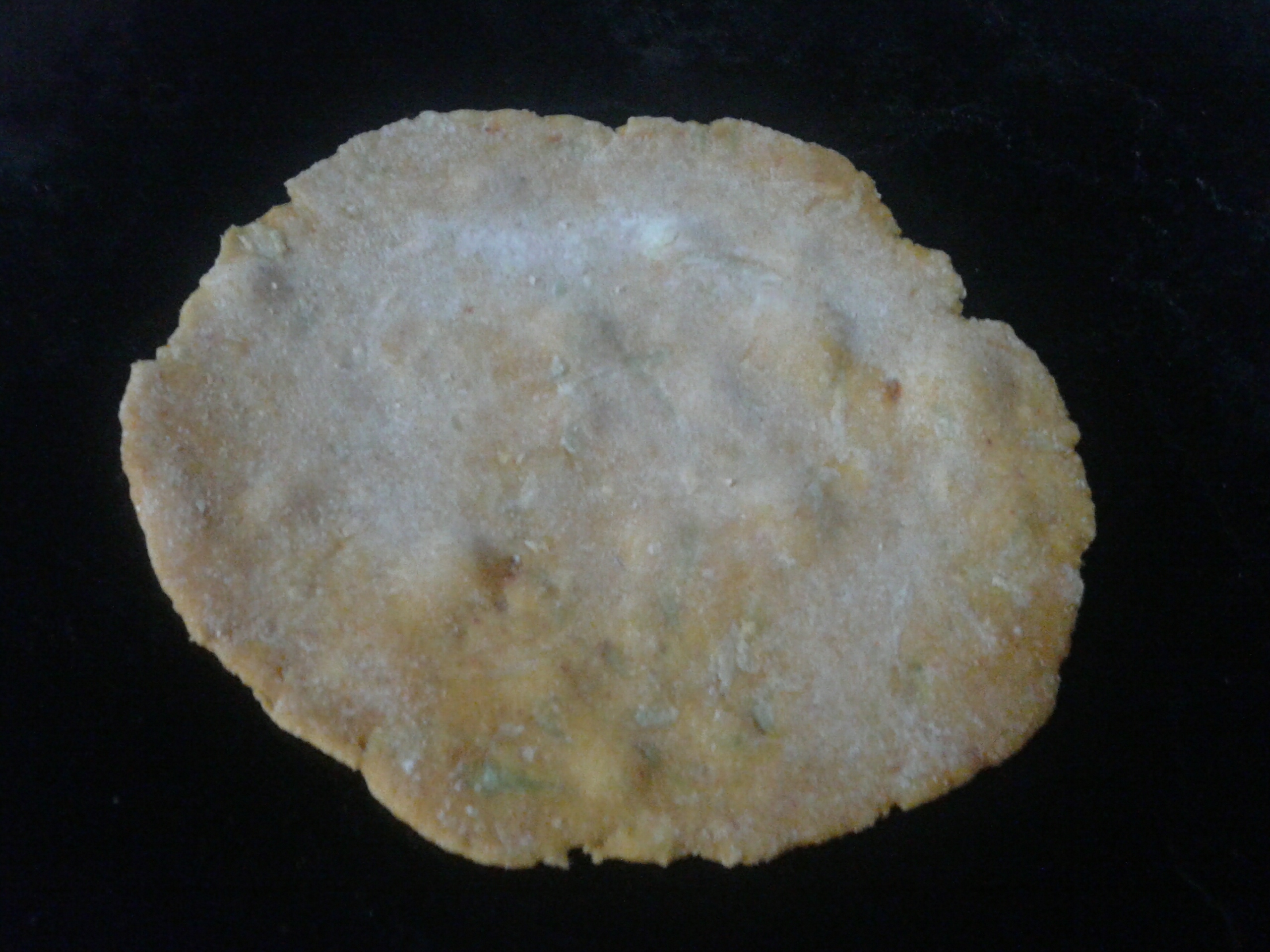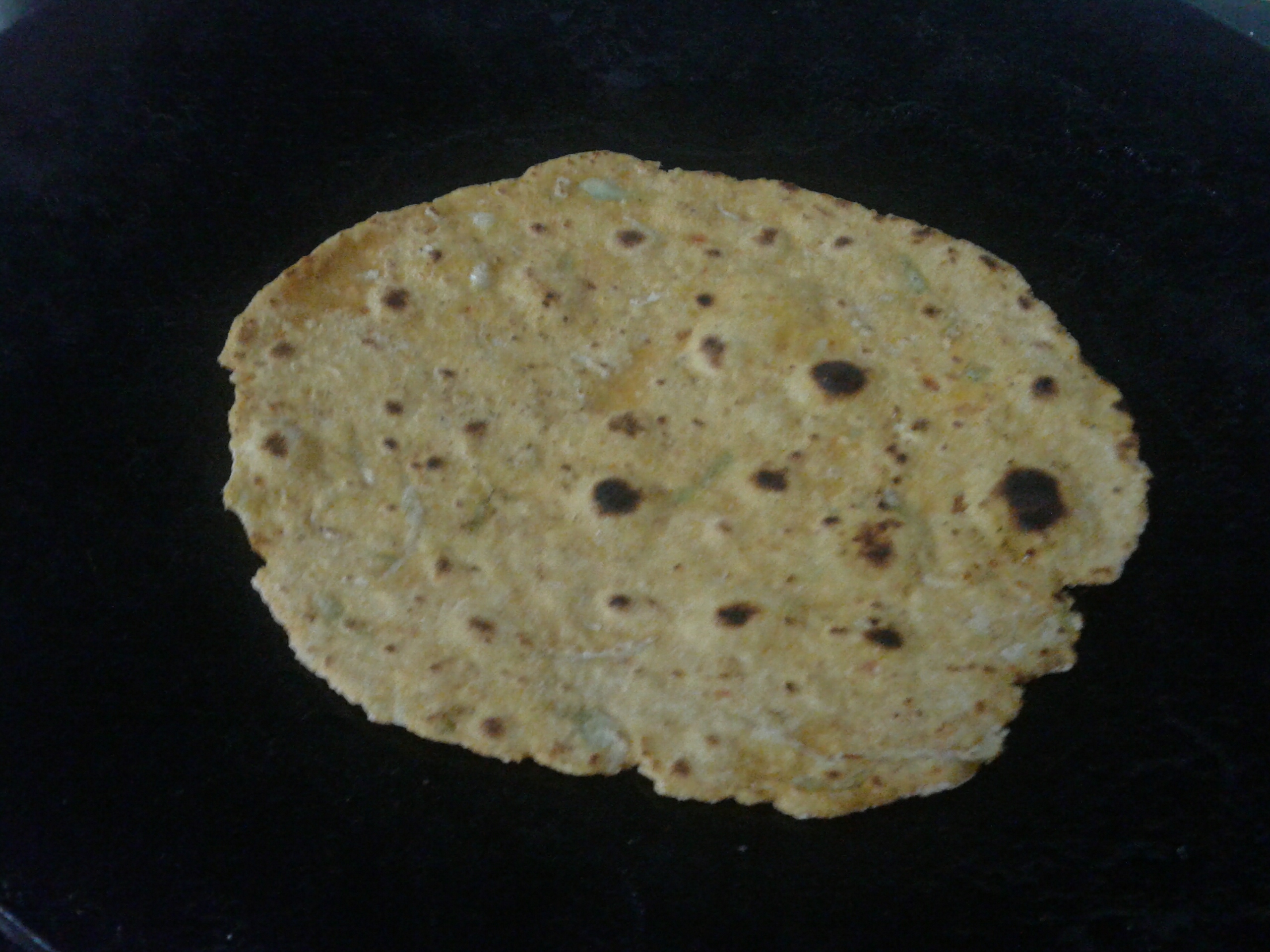 Now take a small portion of dough. On a dusted surface roll like a chapati . It should be thin in thickness. Place on a hot griddle. Allow it to cook on both side on medium flame then with few drops oil roast both the sides like paratha.