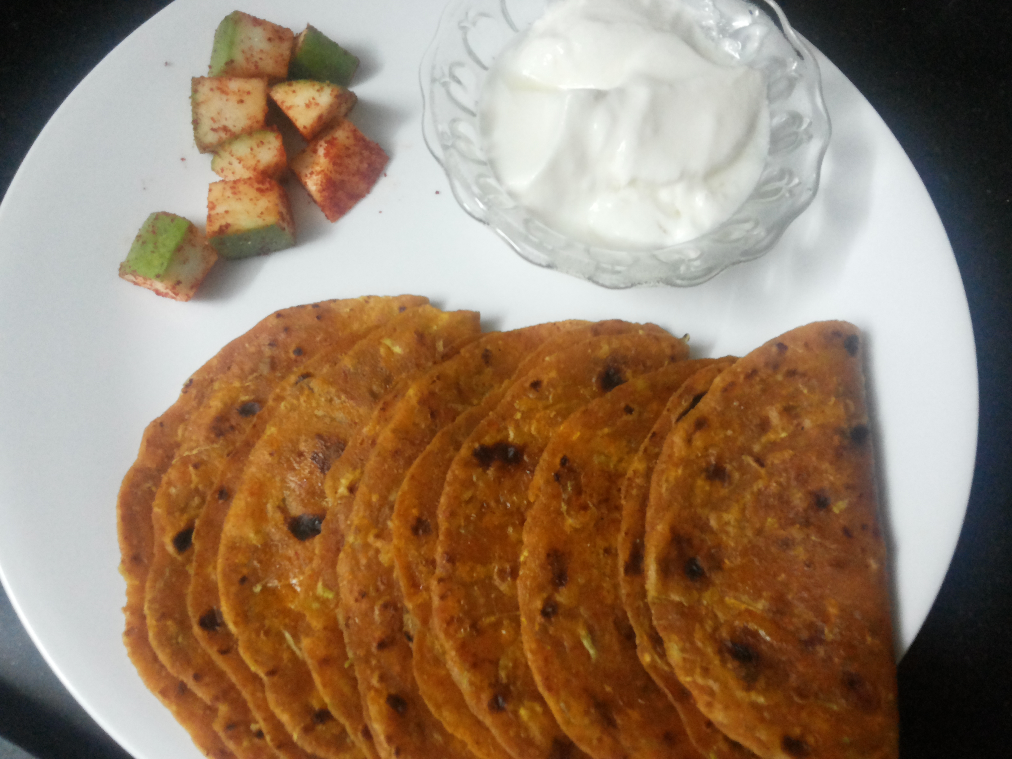 This Thepla s are a very healthy and very light on stomach. I prepared with few drop of oil. Very easy to make . It taste best too with some Potato Gravy or Tea or coffee or even when not so hot. Here i served with Fresh curd and Masala Raw Mango.