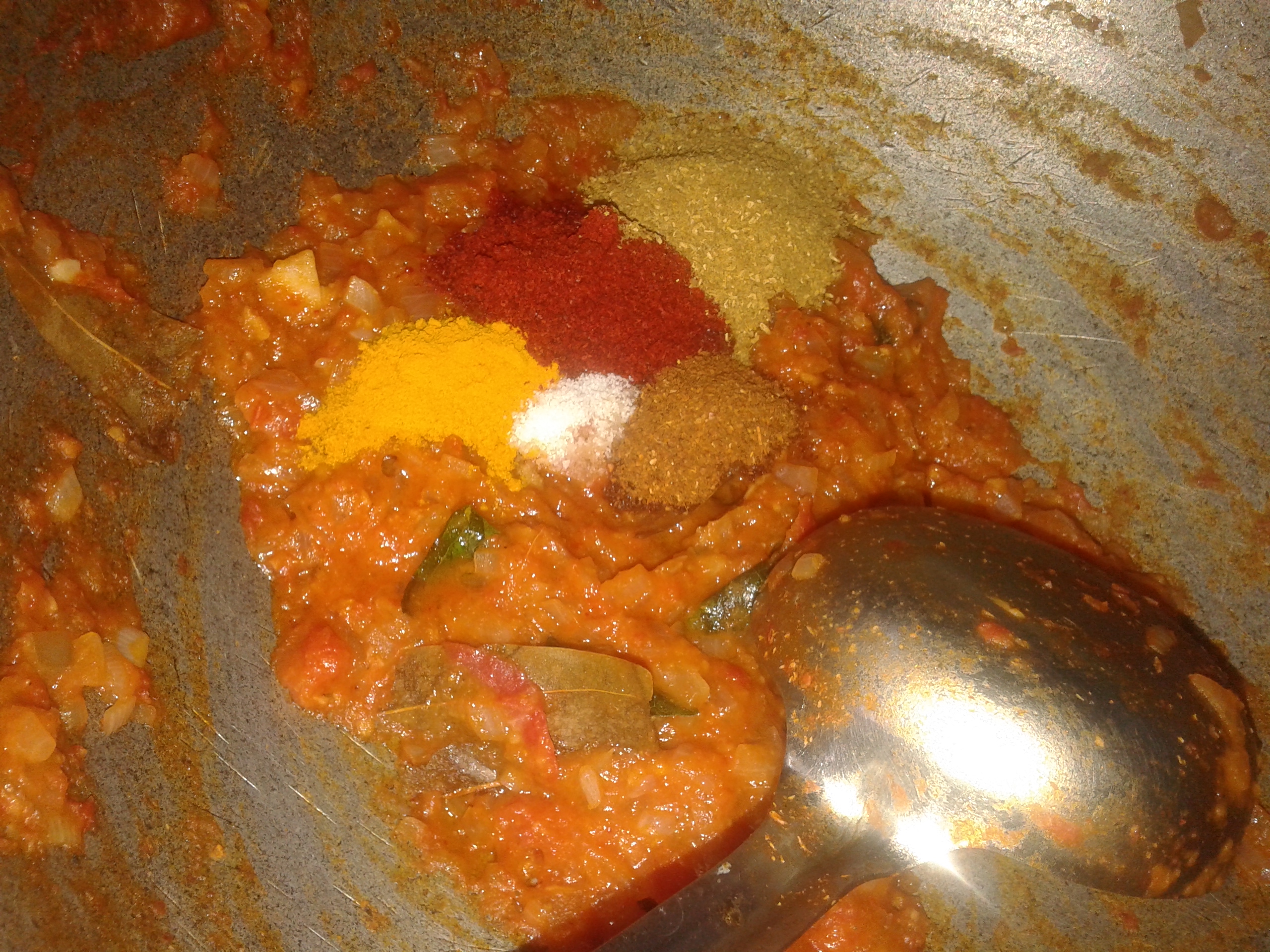Saute tomato puree till all raw smell gone. Then add Turmeric Powder, chilli powder, cumin coriander powder, garam masala, salt . Mix all nicely .