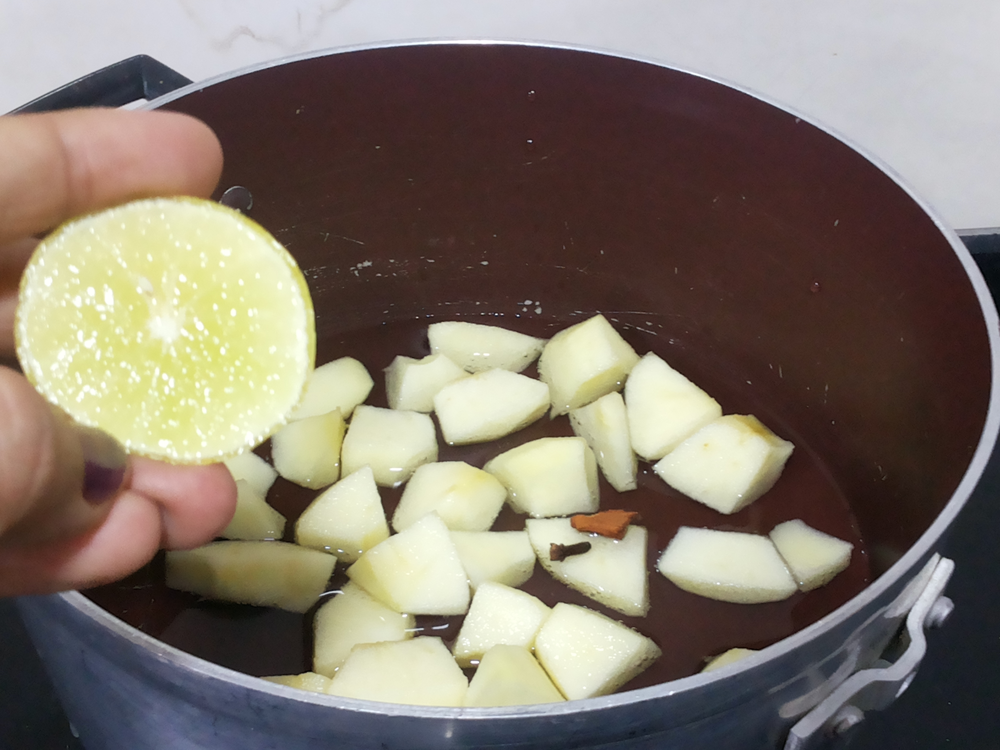 Wash the apples, peel and remove the stalks. Dice the apples (shapes don’t matter) and put in a pan with the lemon juice, cloves, cinnamon stick and water.cover the lid and cook on low heat until the apples are tender and reduced to a pulp. After 15-20 minutes of cooking, when the apples have lost their color and start to look opaque, they’re done.