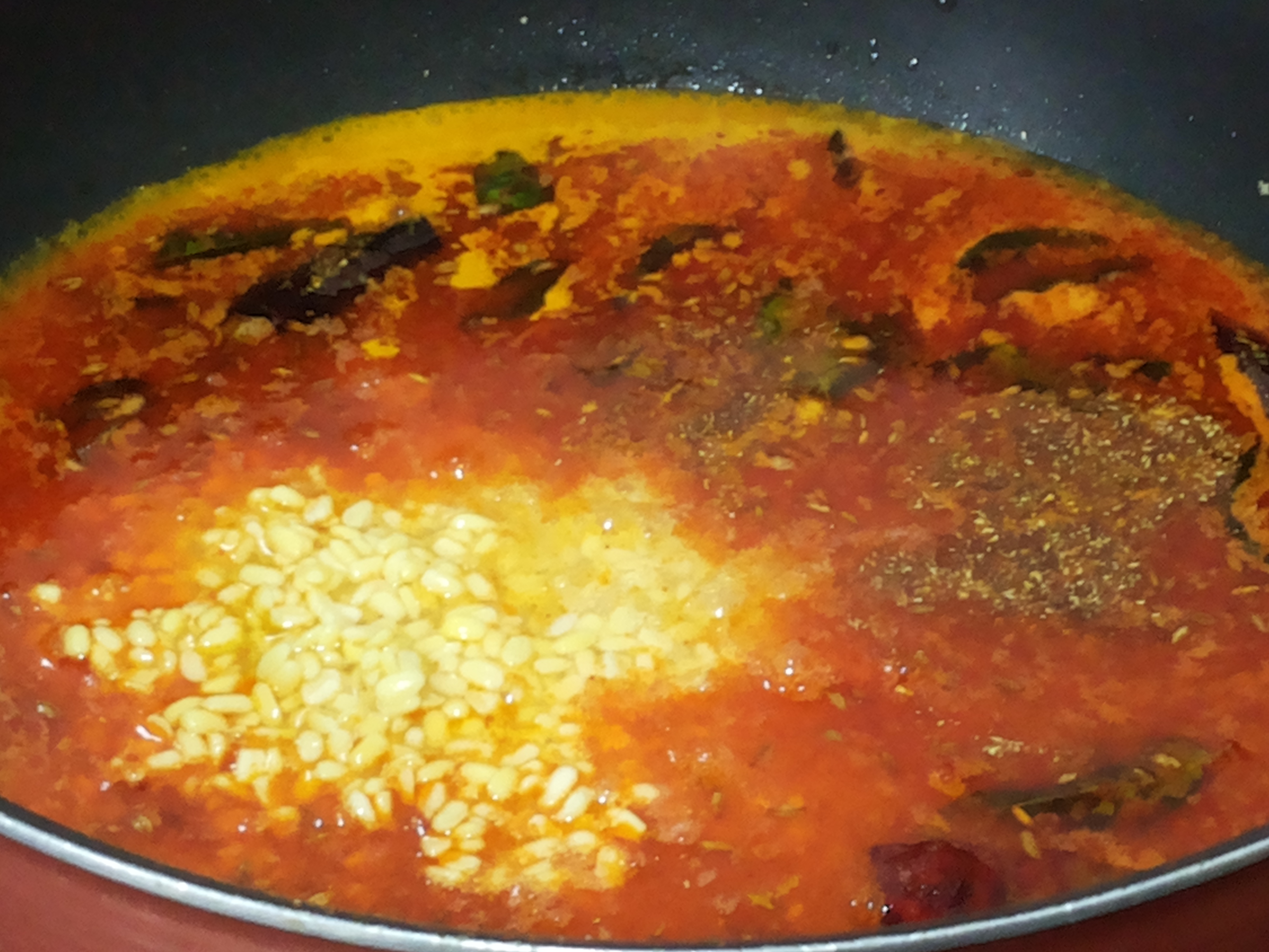 In a non stick pan take Ghee and Oil. When hot add Cumin seeds, broken Red Dry chilli and curry leaves. Now add Hing and red chilli powder with a glass of water. As we add water , the whole temper will come up with nice colour and aroma. Add all other spices and Moong dal. Once it start boiling cover the lid and cook for 8-9 mins or till its almost done.