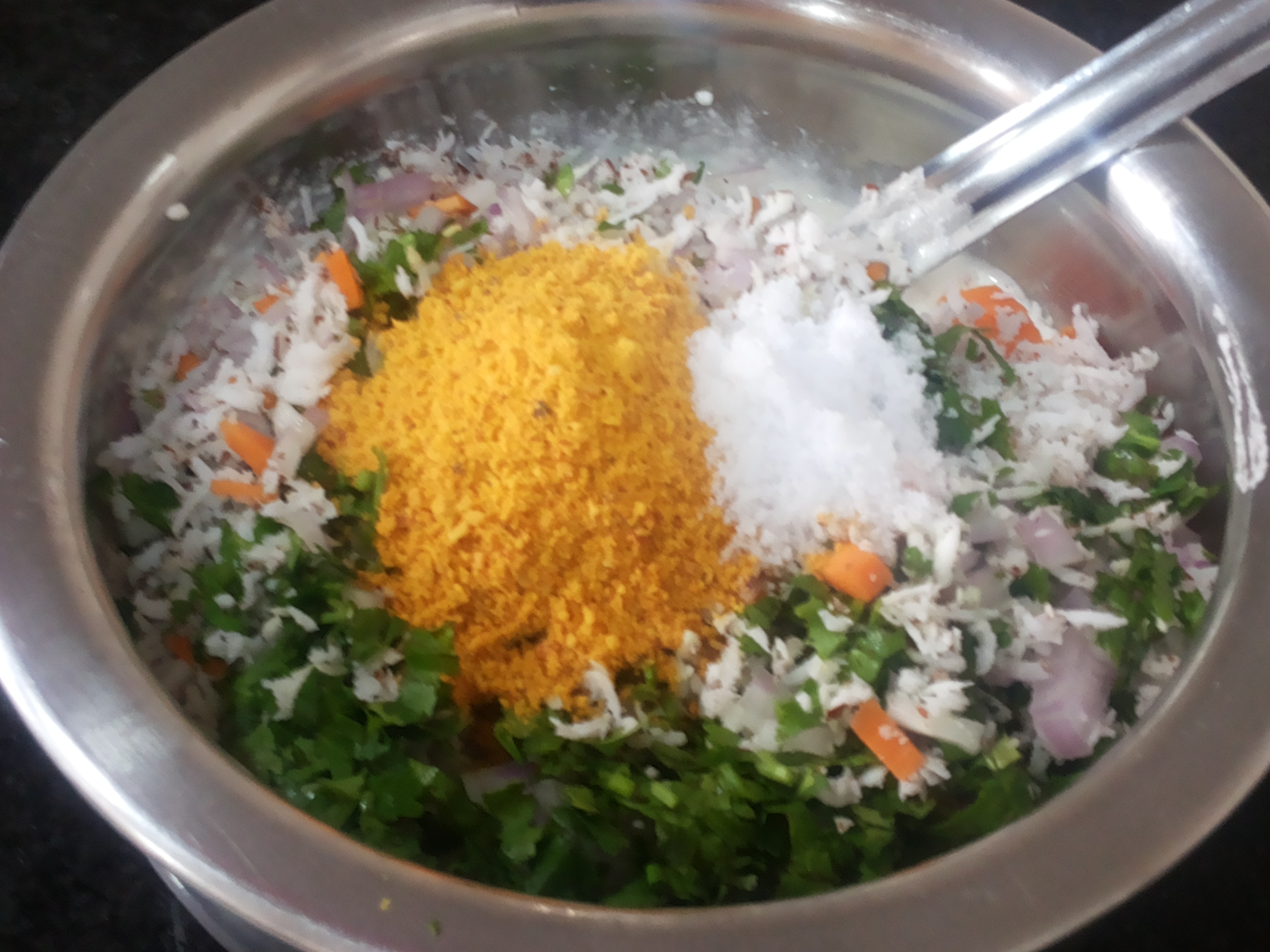 In a wide bowl take Idli batter. Add all veggies , salt , Molga Podi and some water . Mix Well. Make sure Batter is not too thin. After adding veggies Batter consistency should be like idli batter.
