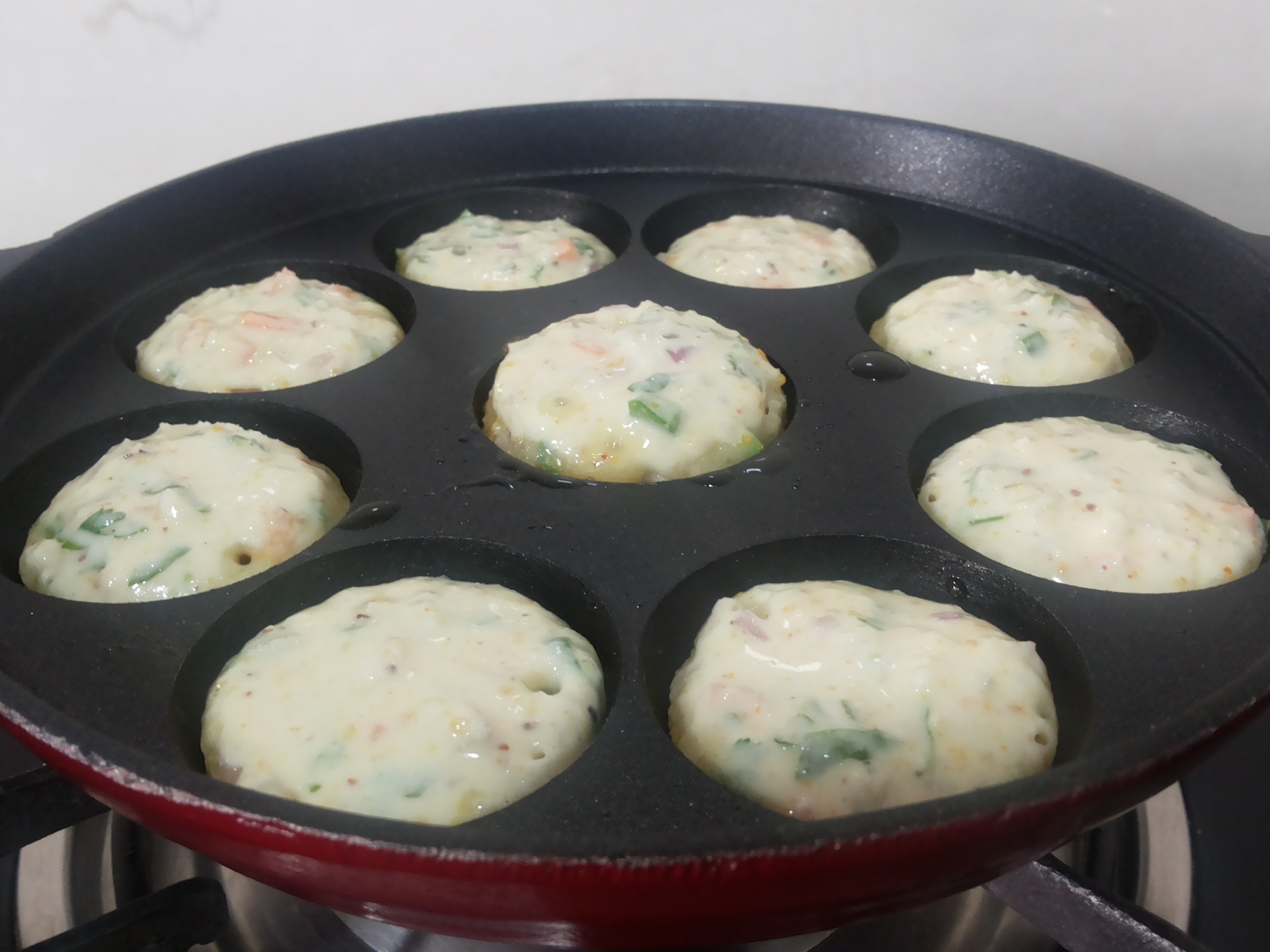 What can be the best use of Leftover Idli Batter ? A quick, delicious , tasty starter / snack and just 2 -3 drop oil used 🙂 🙂 I Gave Flavour of Molga Podi to this little appe. I am sure it goes perfect with even Tea/ Coffee.