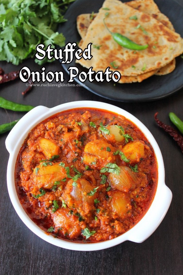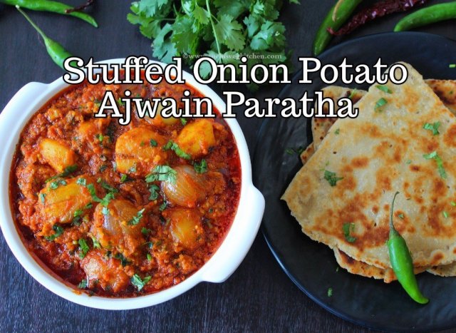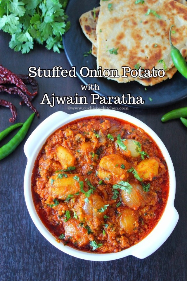 Very Aromatic, delicious, finger licking , spicy Vegetable with very simple stuffing yet very very tasty. Tempting Stuffing filled in Onions and Baby Potatoes. I have served this delicious curry with very flavourful Ajwain Paratha ..