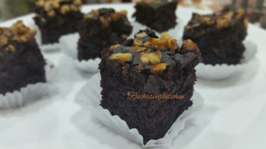 Pour this mixture in a dusted Cake tin. sprinkle Walnuts , Chocolate chips which we kept aside. Now ready to bake. I baked in Cooker. I baked for 45 mins. To bake in cooker, Place a stand in bottom of Heavy bottomed Cooker. Then place cake tin on that. Cover the lid without whistle. One can Bake for more time for perfect Brownie like texture.
