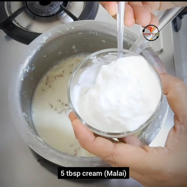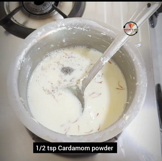 - Add malai, milk powder and sugar to boiling milk. Again cook for 5 mins more on medium flame.. Add Saffron Milk and cardamom powder.