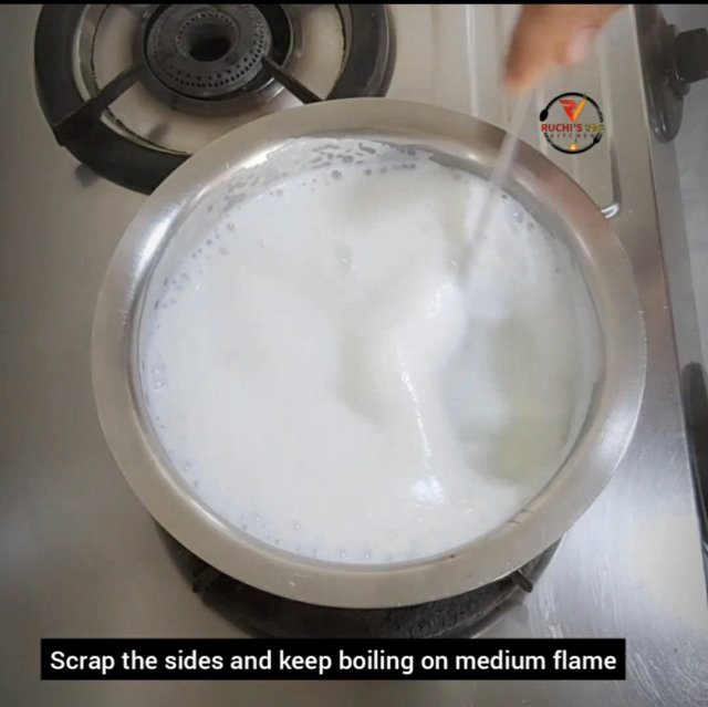 - In a broad vessel , take milk and allow it to boil for 15-18 mins on slow to medium flame. Keep scraping the sides too.