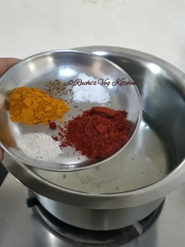 Make butter milk from curd and add bit salt . To make buttermilk for this gravy , make it with normal consistency, Neither too thick nor too thin. Don’t use very sour Curd/ Buttermilk as it will be more sour after cooking. If dont like sour taste one can have fresh curd/ Buttermilk too.