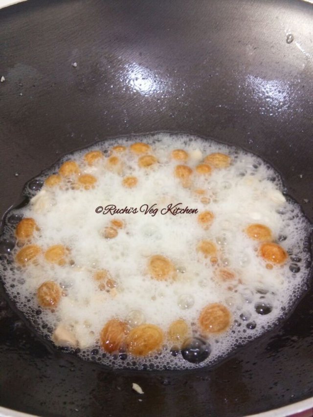 meanwhile, take another vessel and prepare sugar syrup by taking 1 cup sugar and ¼ cup water. Boil till you get one string consistency.