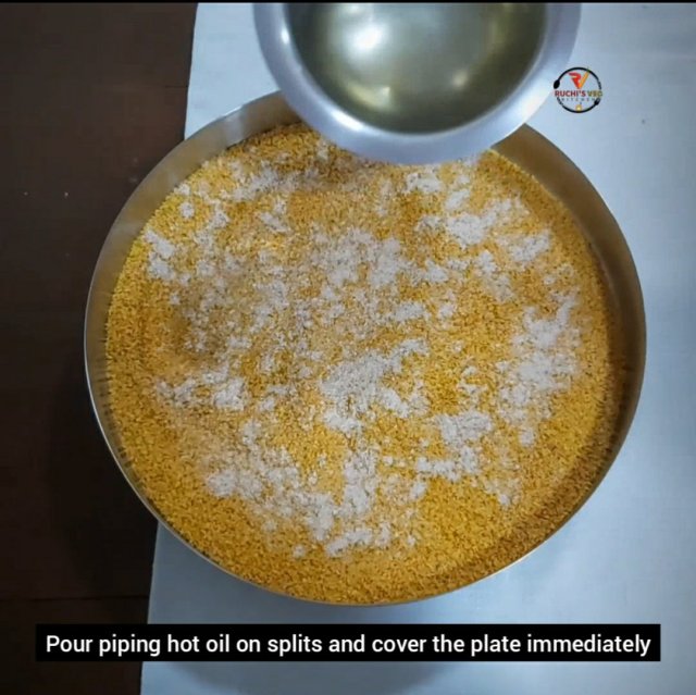 - Pour this hot oil on splits and immediately close the lid. Such way splits and asafoetida will be cooked and will give lovely aroma and taste in the masala.