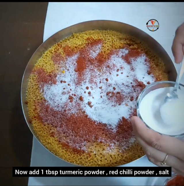 - After 30 to 40 mins (when mixture is cooled), open the lid of Kuria mixture. Add salt , red chilli powder and turmeric. Mix well. Make sure each spices blends perfectly..