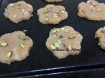 Grease your hands and do plastic sheets .. Place the almond dough between sheets and roll a thick disc. Now sprinkle chopped Pistachio and roll it again once or twice. With the help of cookie cutter just cut into desired shape. Place each shape on greased baking tray.