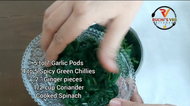 - In a mixer jar , take garlic pods , green chillies, ginger pieces , fresh coriander and cooked spinach. Add 1 to 2 tbsp water and grind into smooth paste.