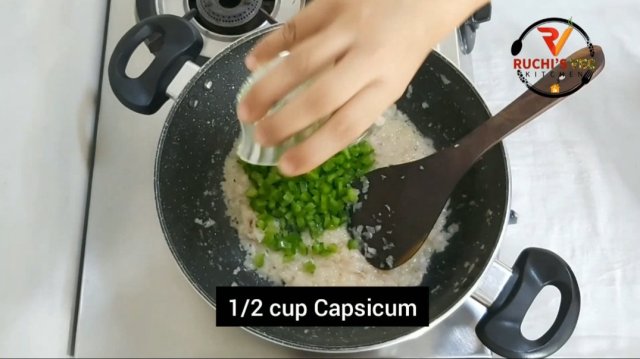 - In a pan , heat butter and oil. Add chopped onions . Cook it till it’s fully done. Add chopped capsicum . Cook for more a minute.