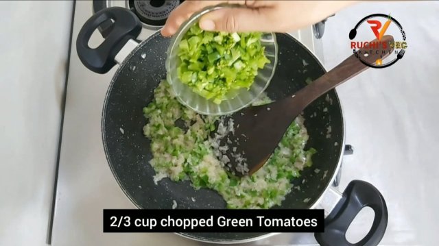 - Add chopped green tomatoes. Mix well. Cover the pan and cook till tomatoes are fully cooked and soft.