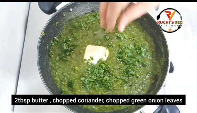 - Add butter, chopped green coriander and some leaves of green onions .
