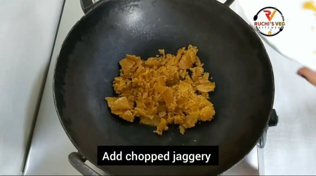 In a heavy bottomed pan , heat Ghee / Oil. Add chopped jaggery in it. Keep stirring and cook for 2 to 3 minutes. Cook on slow to medium flame.