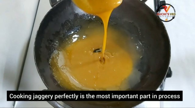 - Take a drop of melted jaggery in a bowl full of water , if jaggery can form a ball and don’t stick to fingure, it’s ready.
