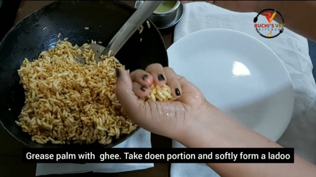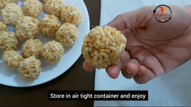 - Roasting puffed rice is very important else , balls/ ladoos will turn soft once cooled completely.