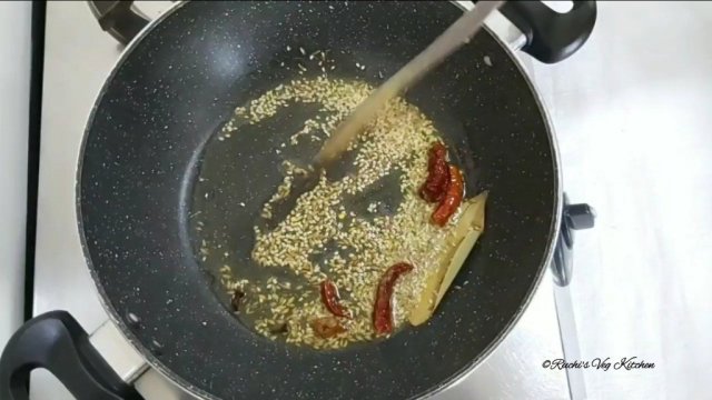 - In a broad wok, heat the oil. Add clove, cinnamon, bay leaf, red dry chillies , roast for few seconds..